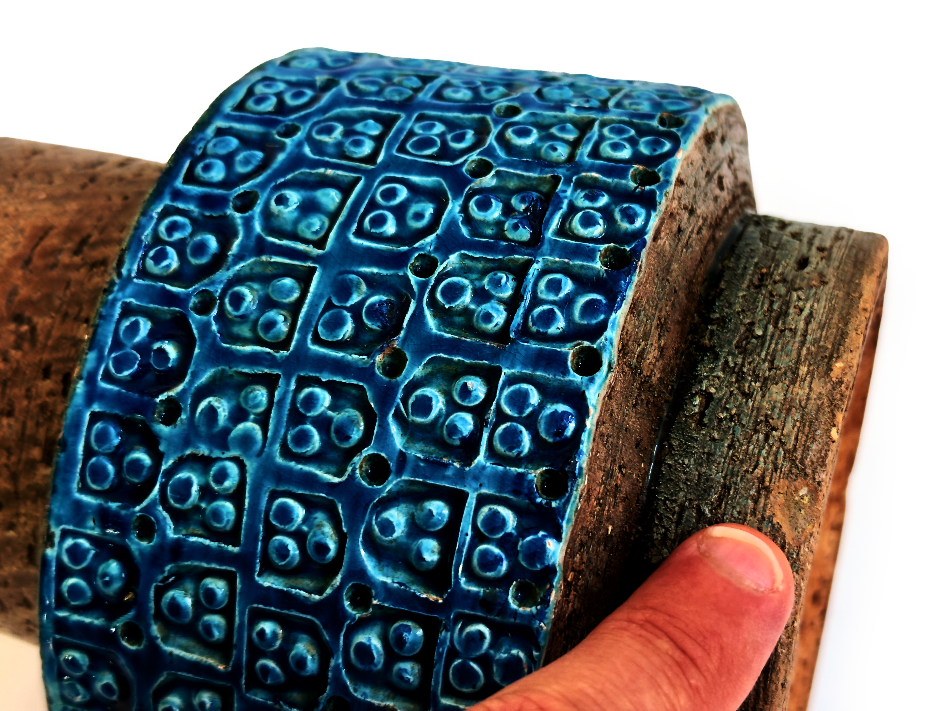 The ceramics in the Rimini Blu collection are characterised by graphic motifs stamped into the surface texture. It’s a fantastical round dance of geometric elements, highlighted by quick touches of colour set beneath the vibrant blue glaze, which the crystalline layer makes luminous like marine reflections.