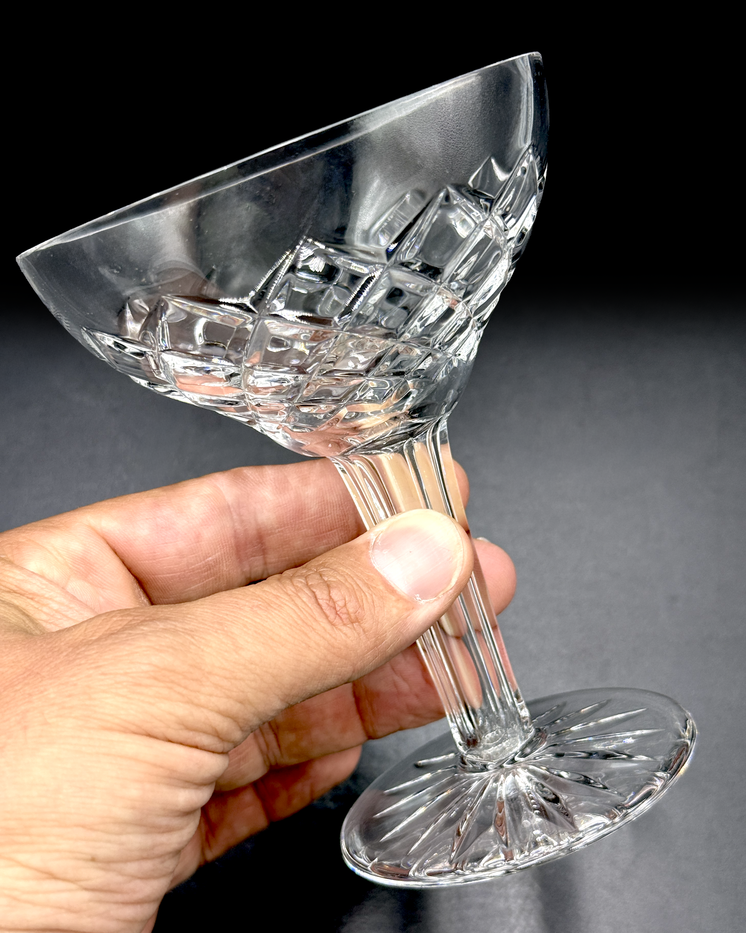 This exquisite set of six hollow-stem crystal champagne coupe glasses are the epitome of next-level class. Perfectly cut diamond fan design with striking lines along the stem and base. Incredible detail across rare and hard to find set.