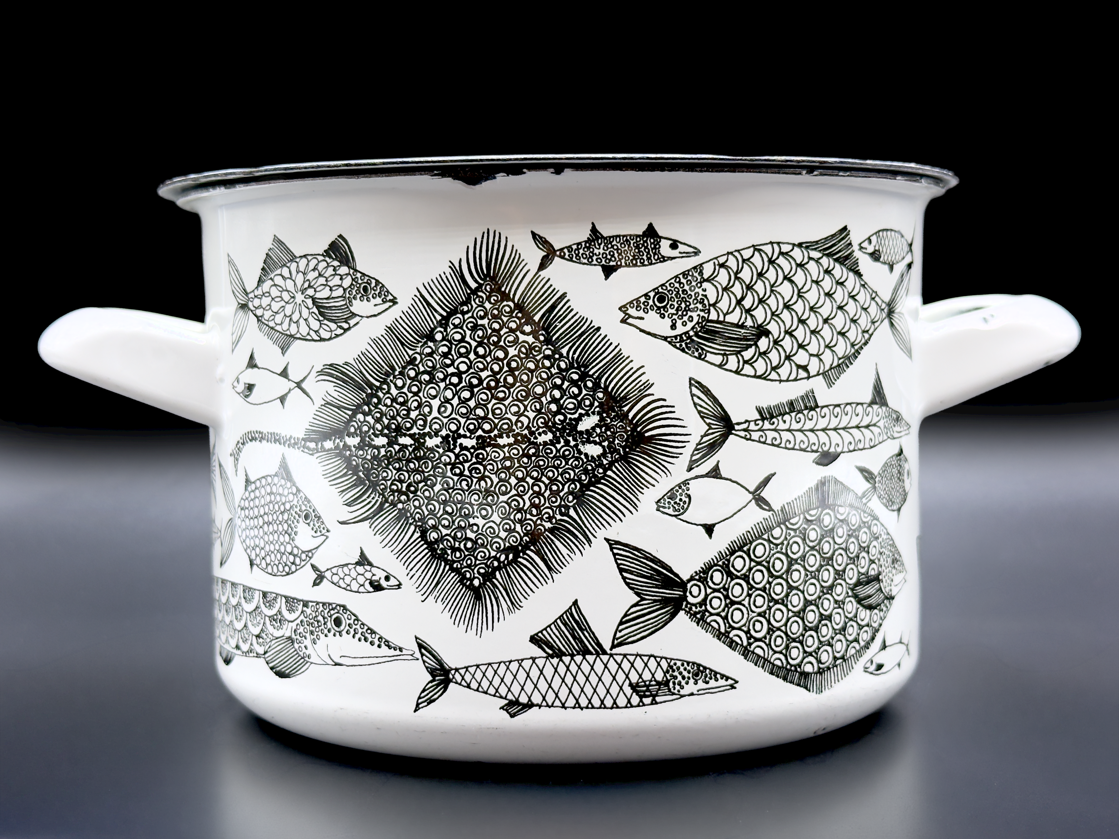 Respected illustrators Raija Uosikkinen and Esteri Tomula designed patterns for the enamelled products produced for the company – patterns such as Ritari (Knight), Punahilkka (Red Riding Hood), Vegeta and Neptune were some of their well-known illustrations.