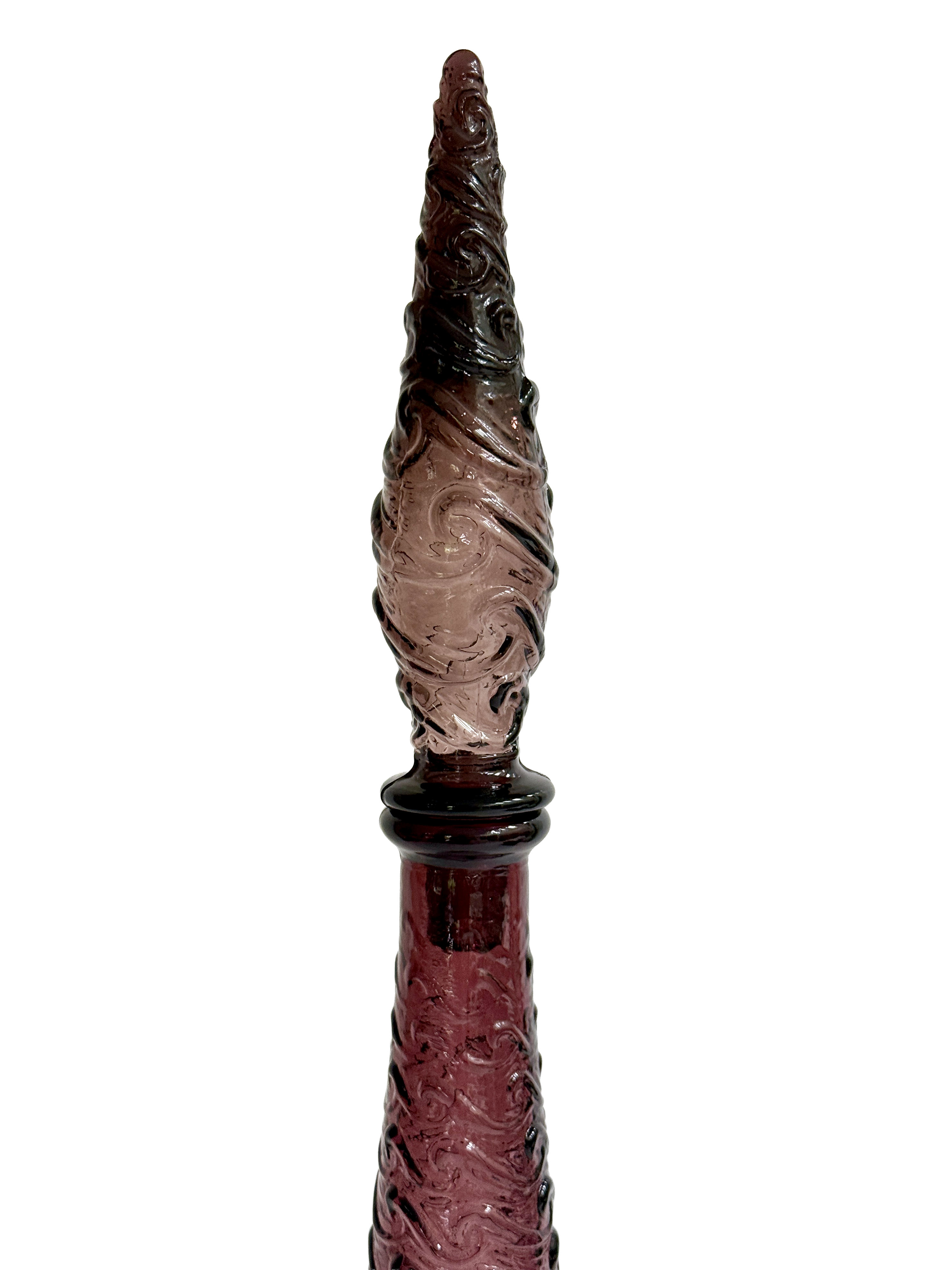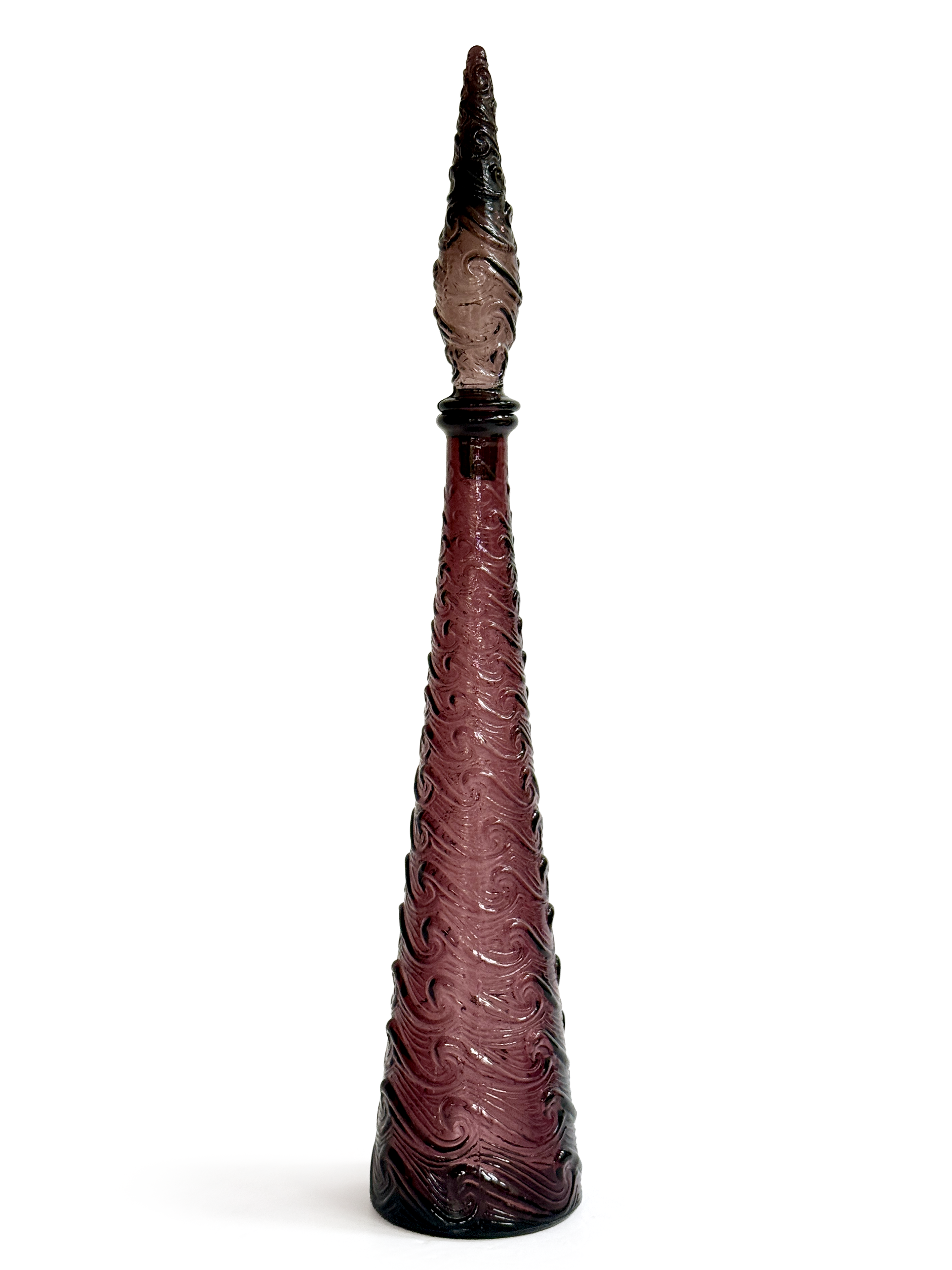 A tall conical decanter/bottle (aka 'genie bottle'), complete with original glass stopper.