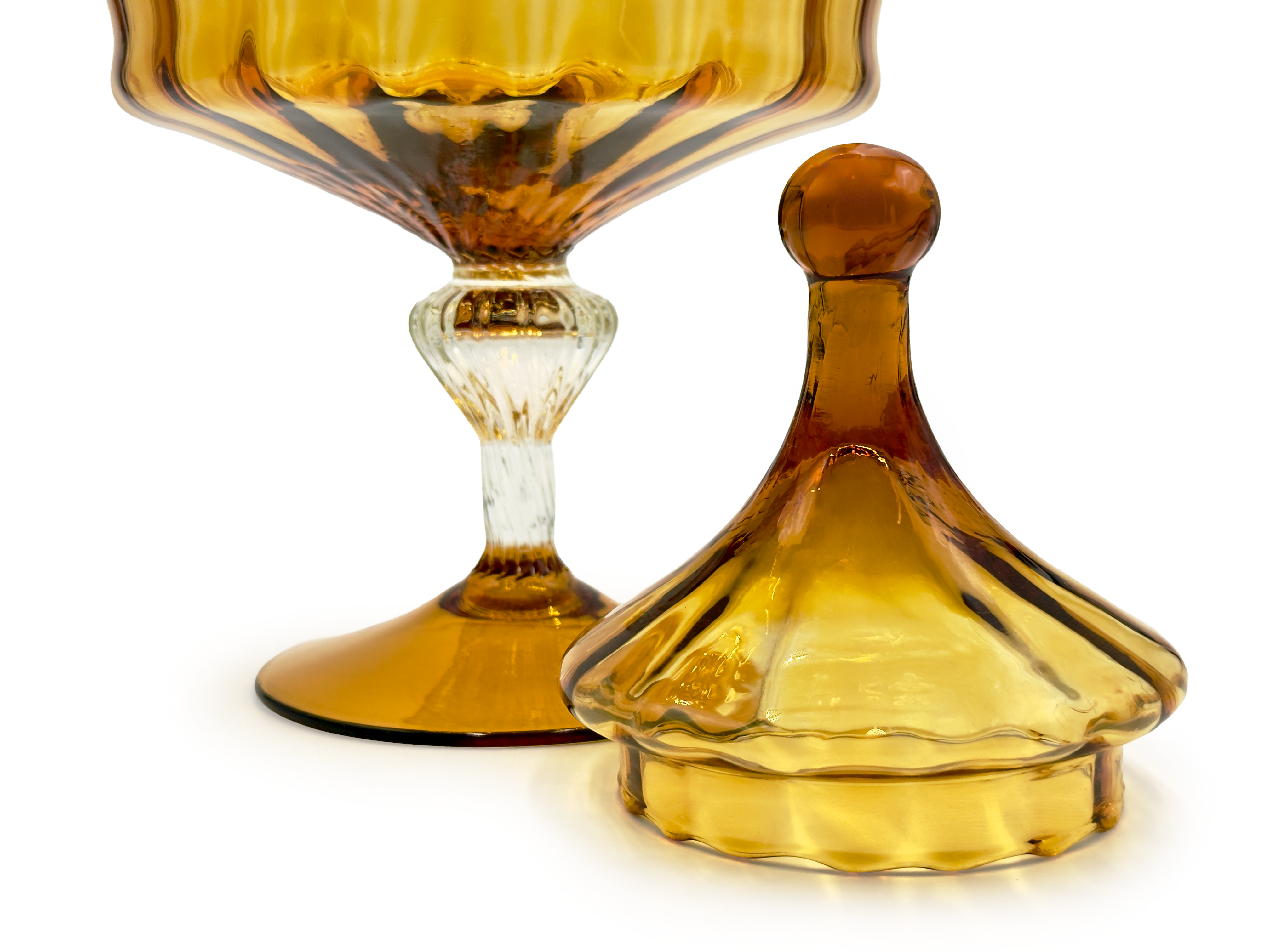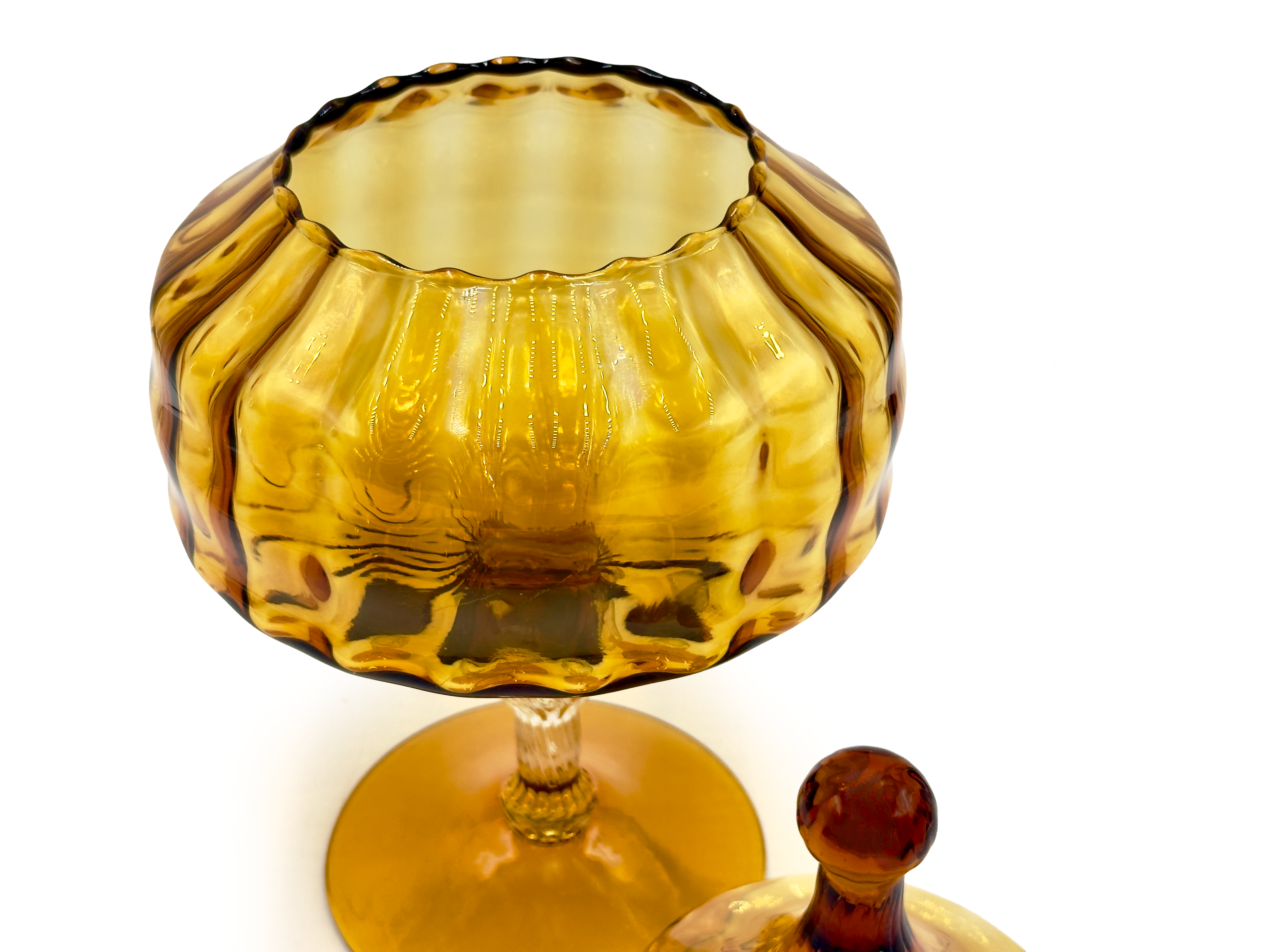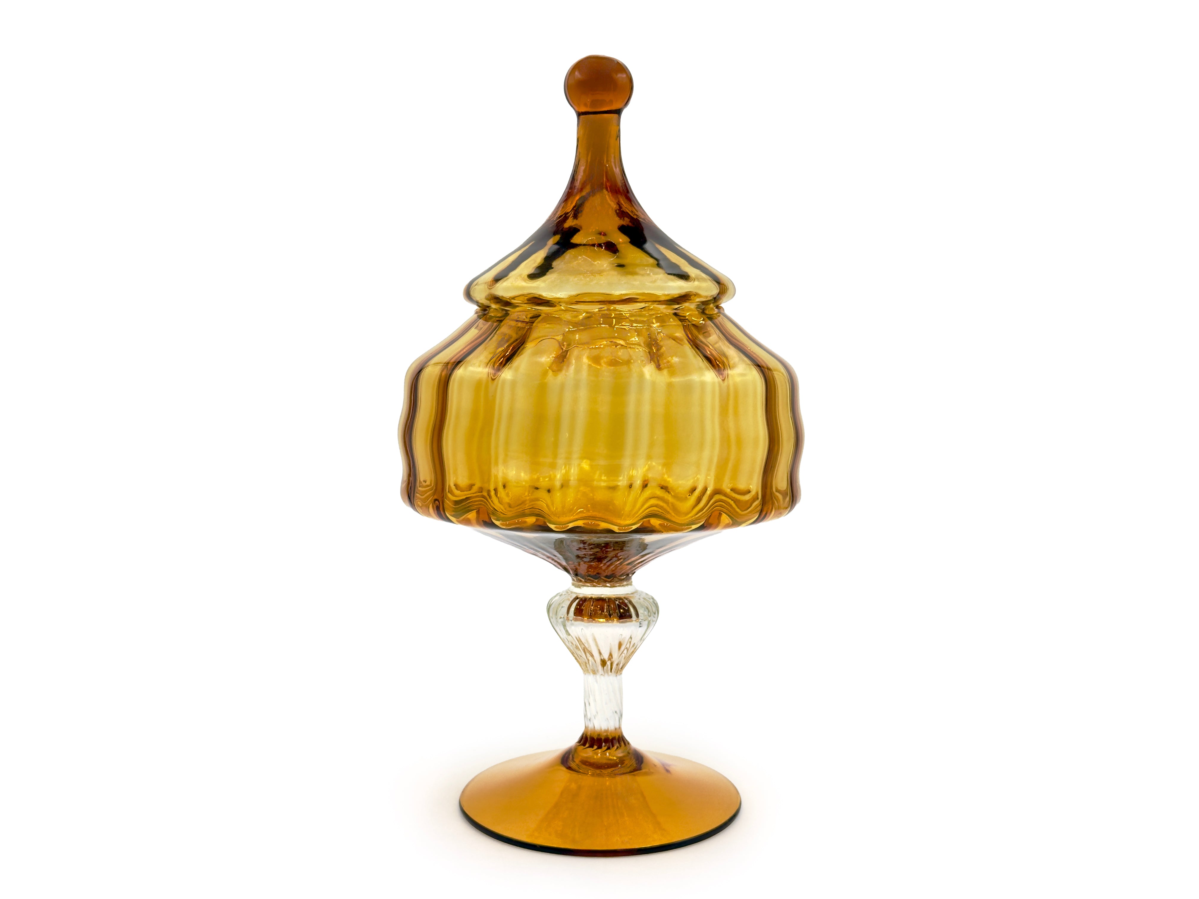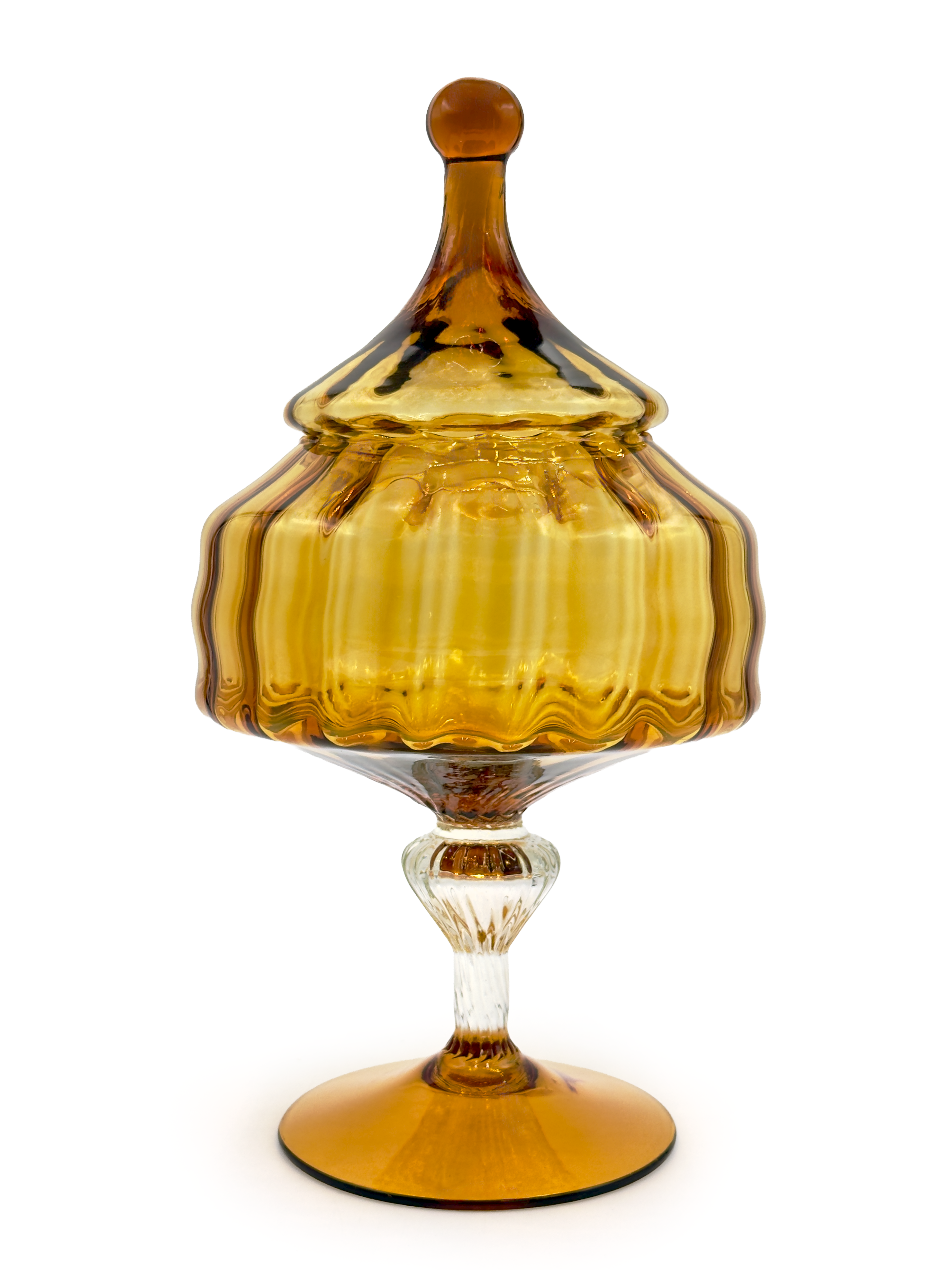 During the post-war economic boom, the region pivoted. The production of highly decorative art glass in Empoli and the surrounding areas reached an all-time high, bound strictly for Western international markets. Throughout the 1950s and into the early 1970s, vibrant cased glass vessels, heavily textured vases, and the now-iconic 'genie bottle' decanters were exported en masse. They were sold at various prominent department stores across the United States, the United Kingdom, and Australia.