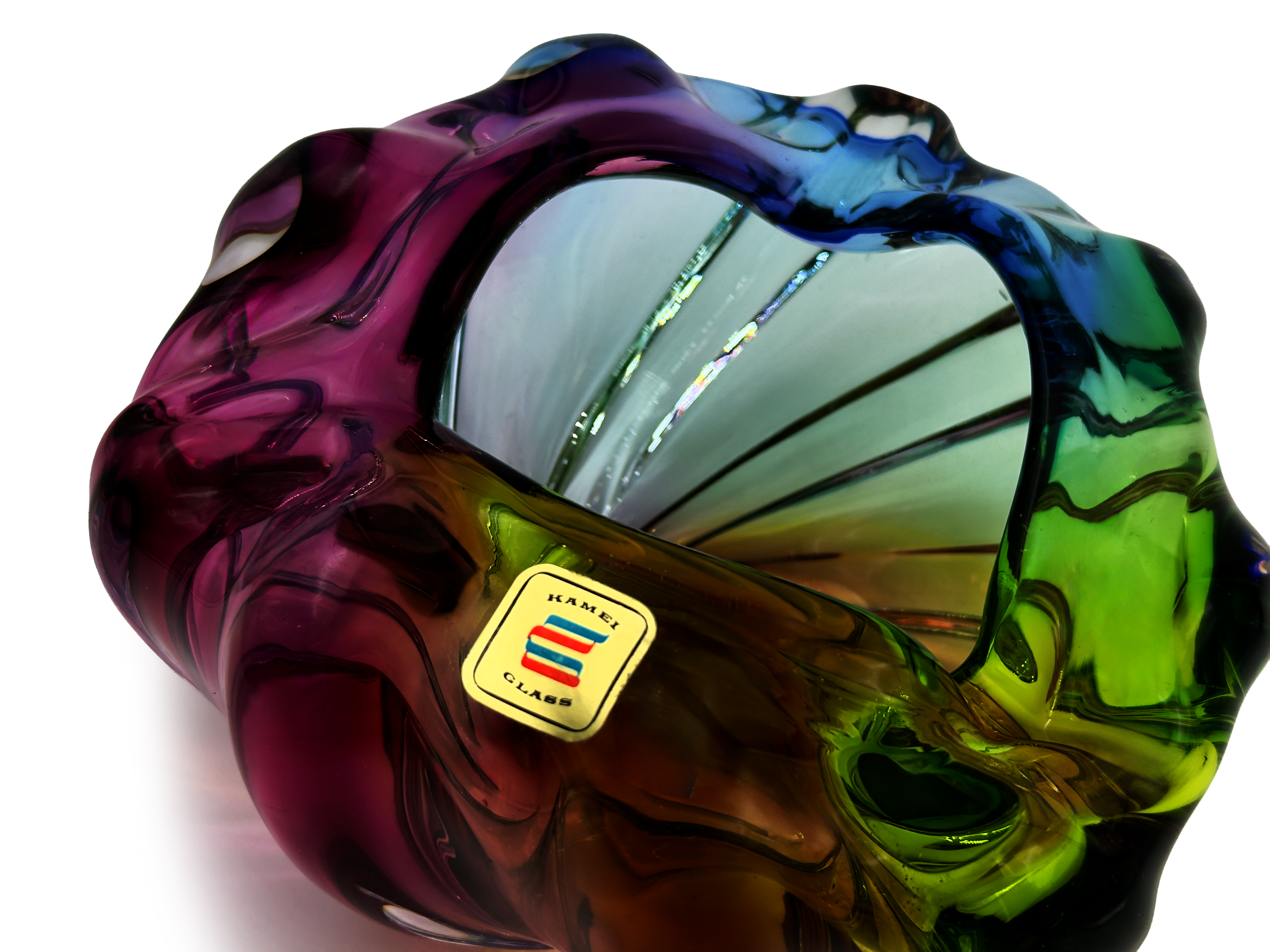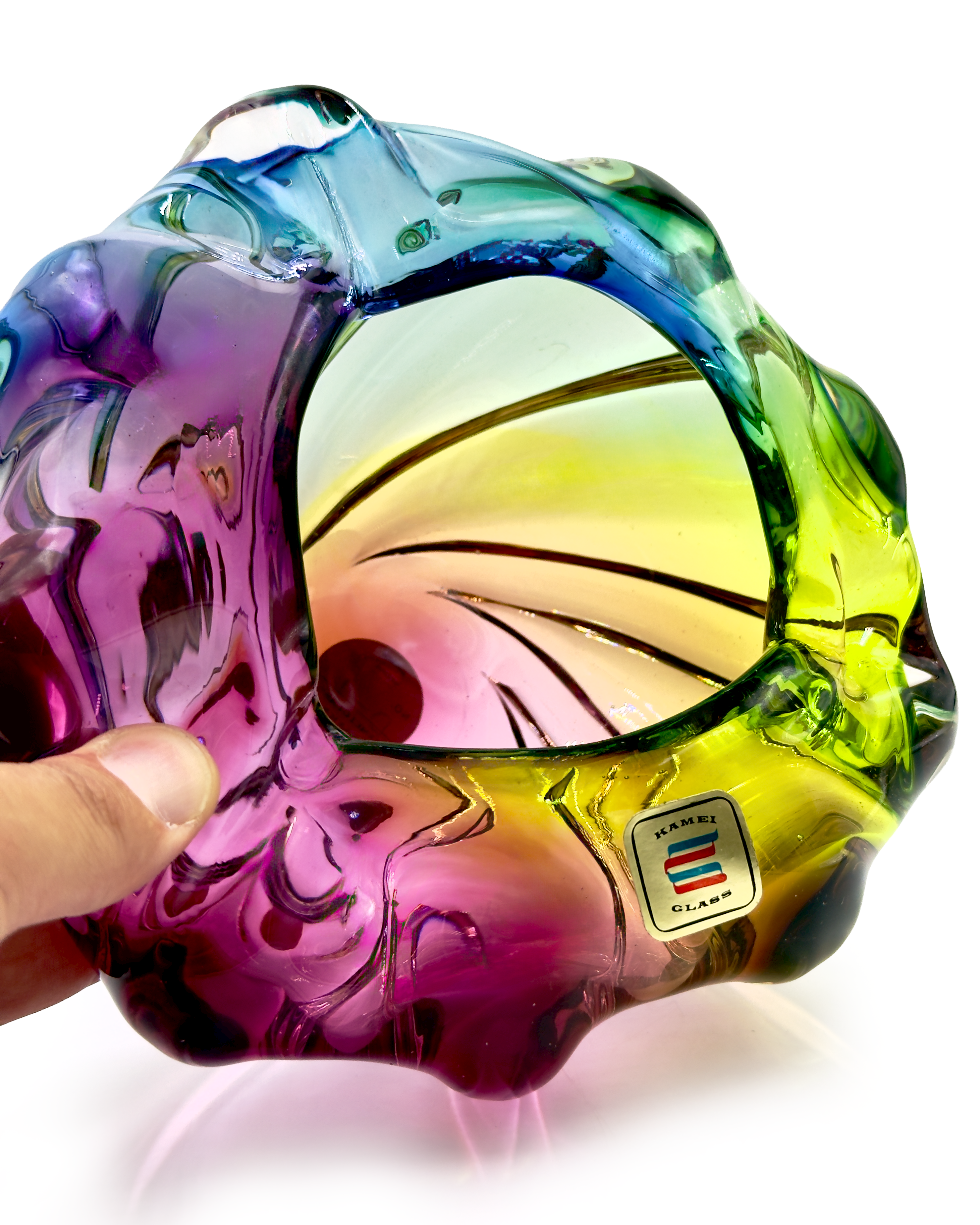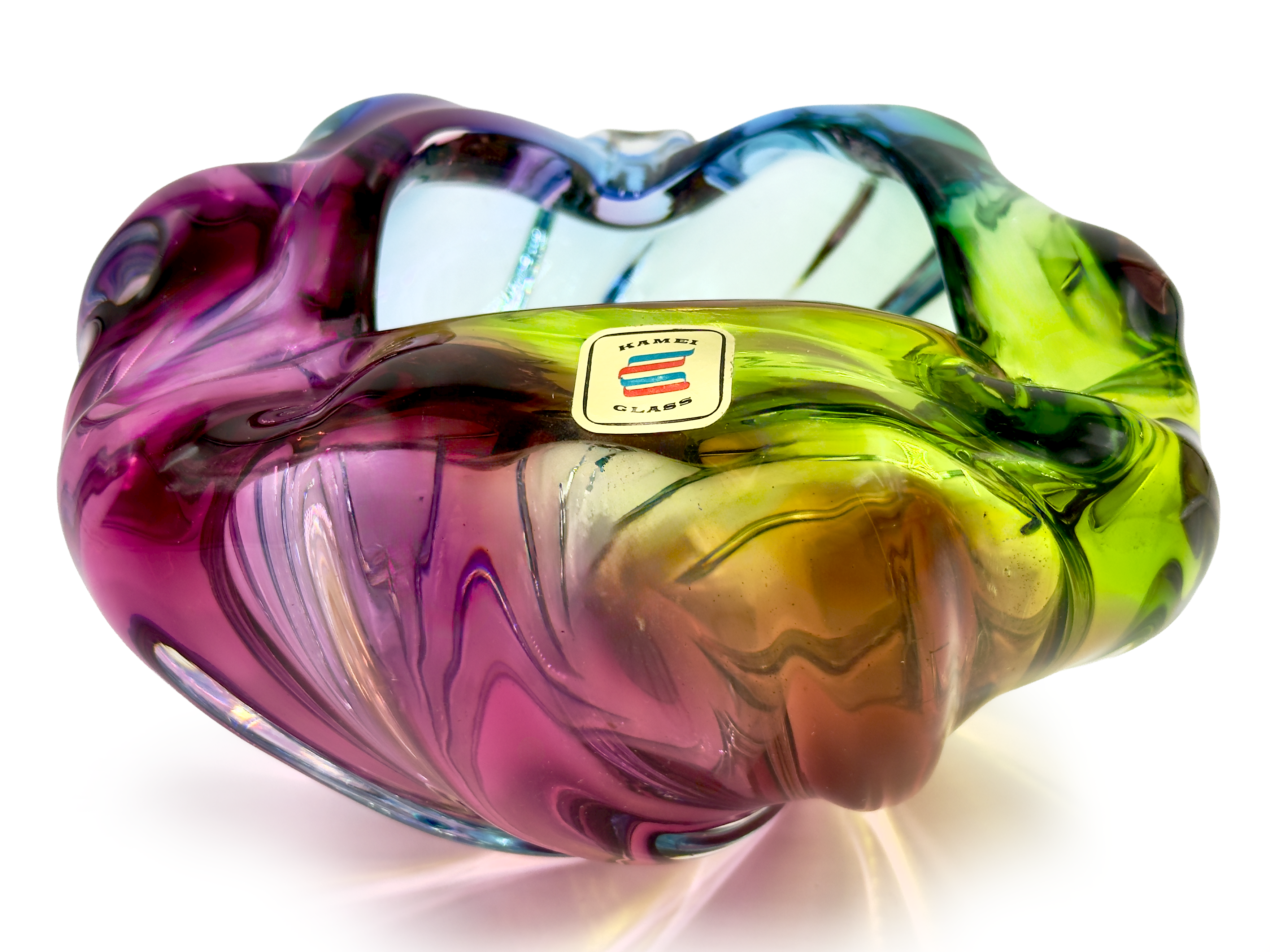 Iwatsu Glass (Japan) from their ArtGlass range | Art Glass 'Rainbow' 7" Ashtray/Bowl , in Blue/Chartreuse/Pink *RARE FIND*