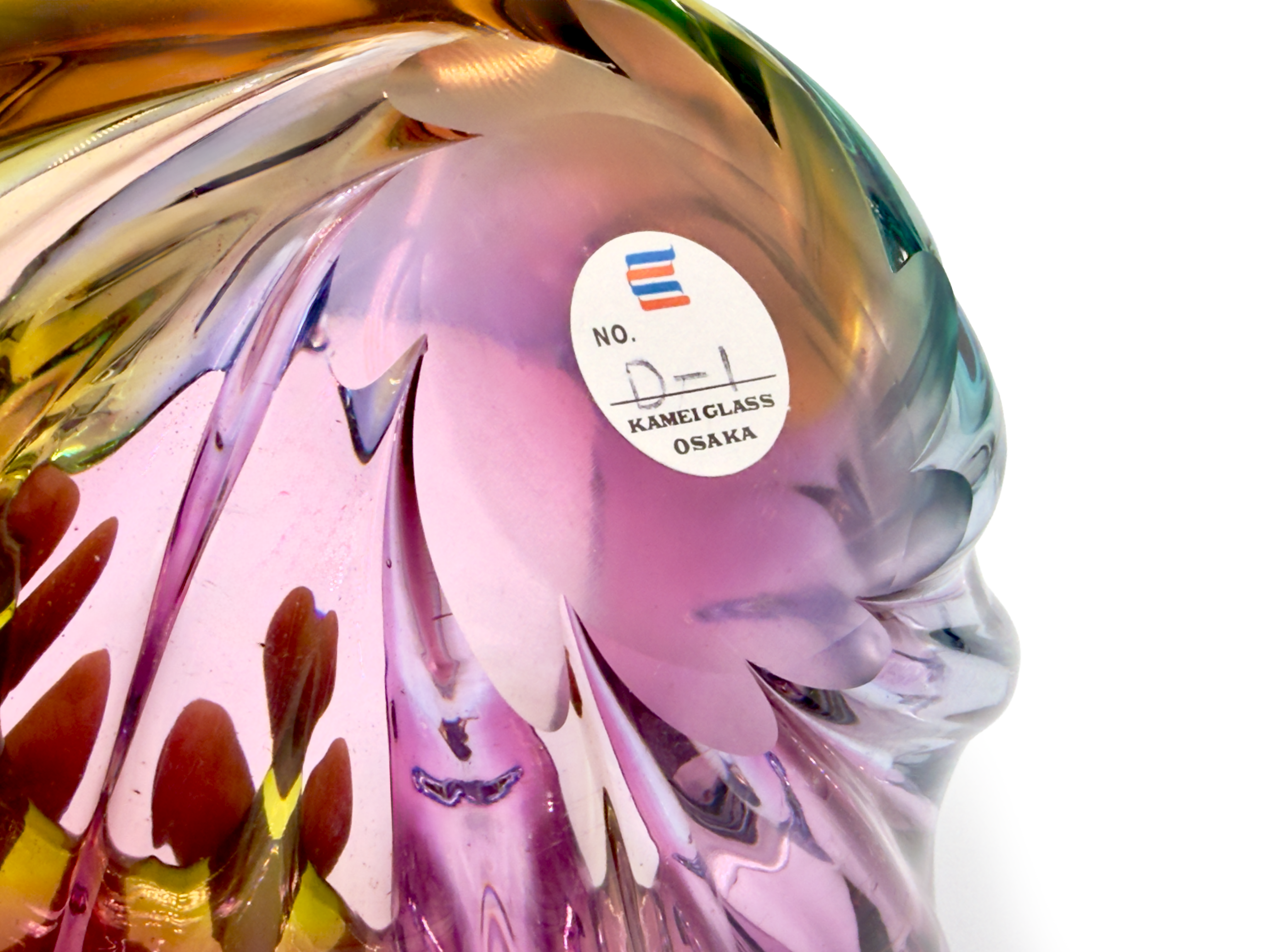 Some pieces were distributed under the Kamei Glass or Nanbu Glass branding, showcasing their label rather than the Iwatsu Glass label.