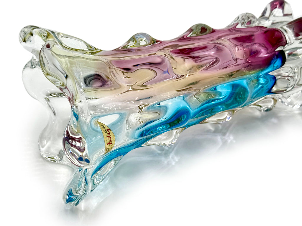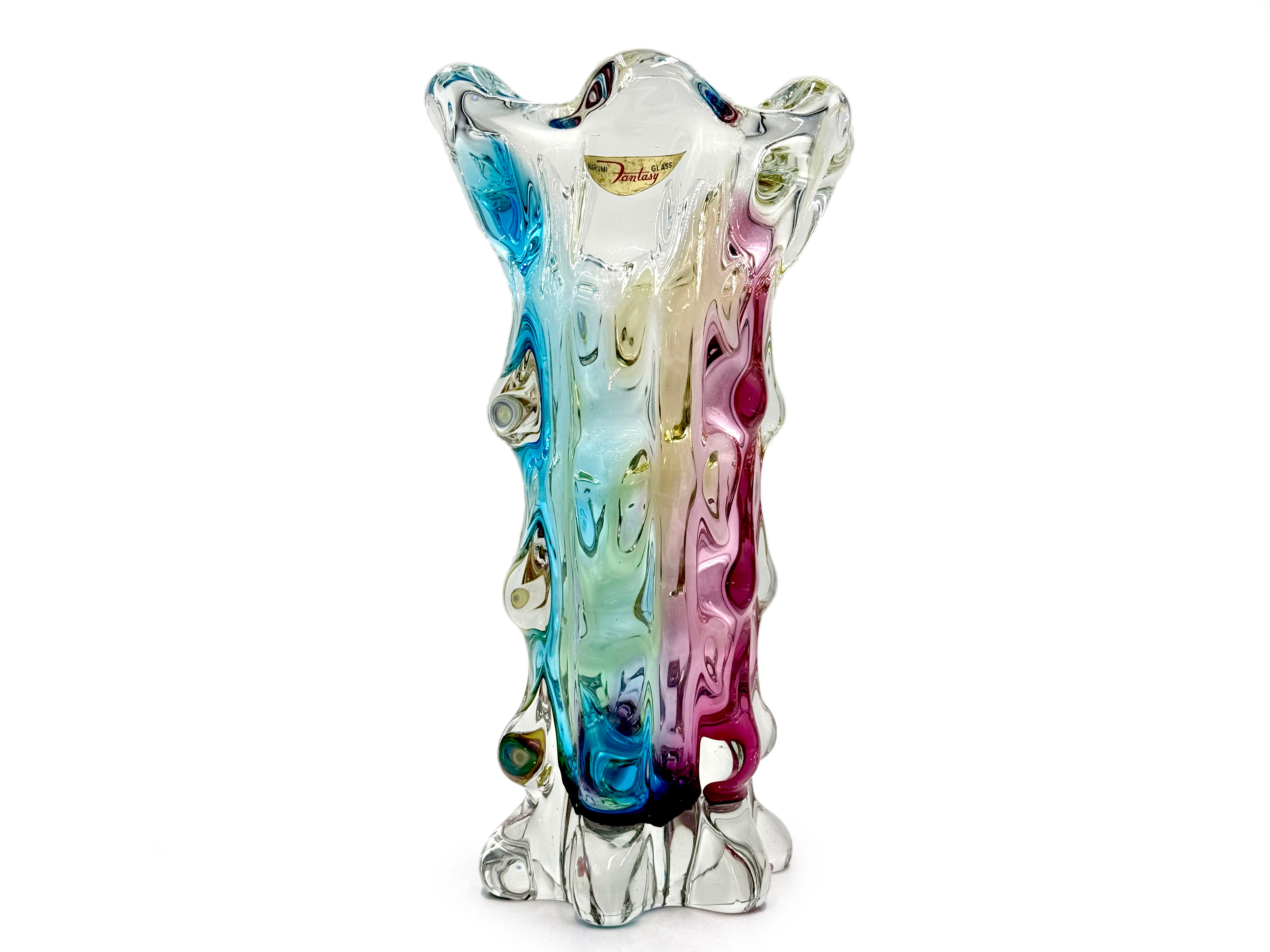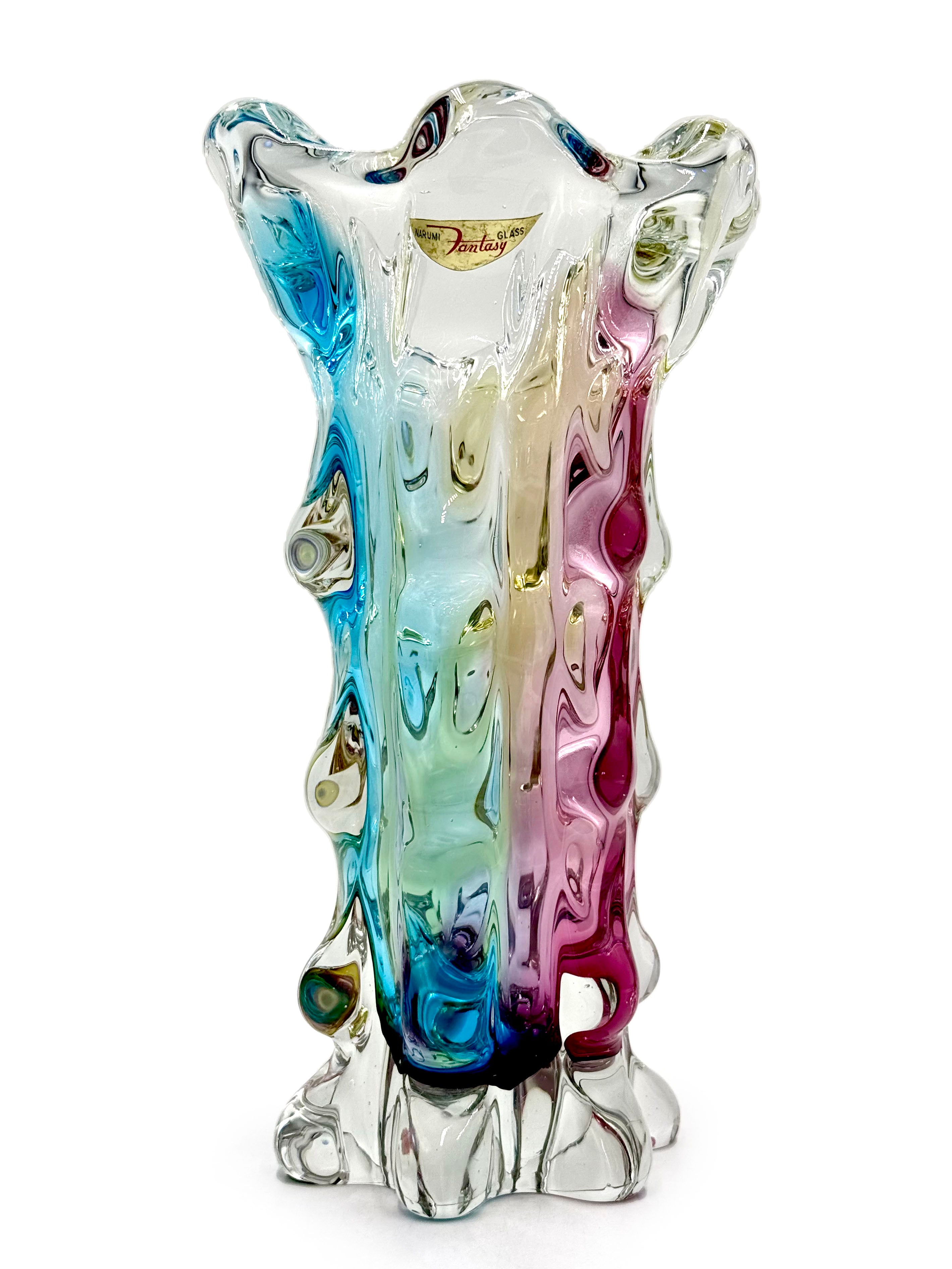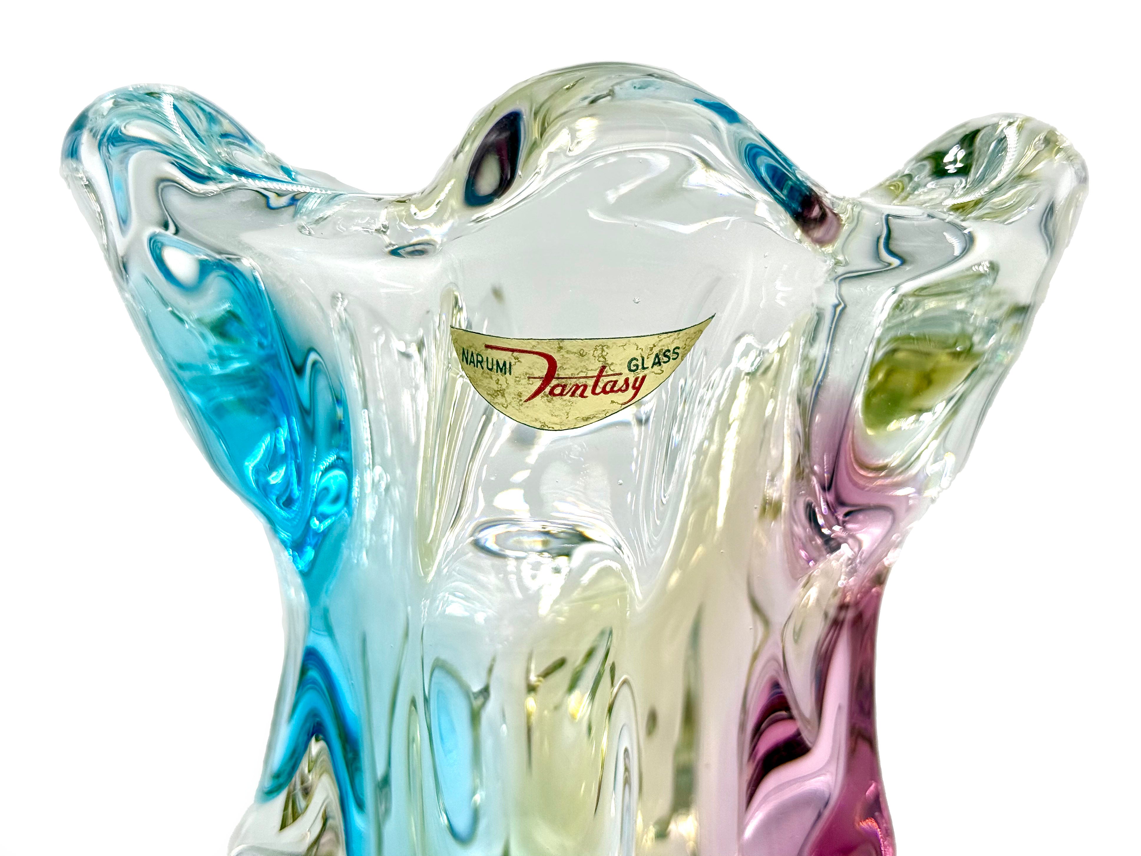 A gorgeous tall vase from the company's 'Fantasy' line, produced under the Narumi branding. This particular piece includes blue, orange and pink through the clear glass.