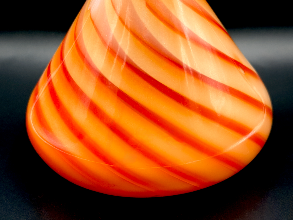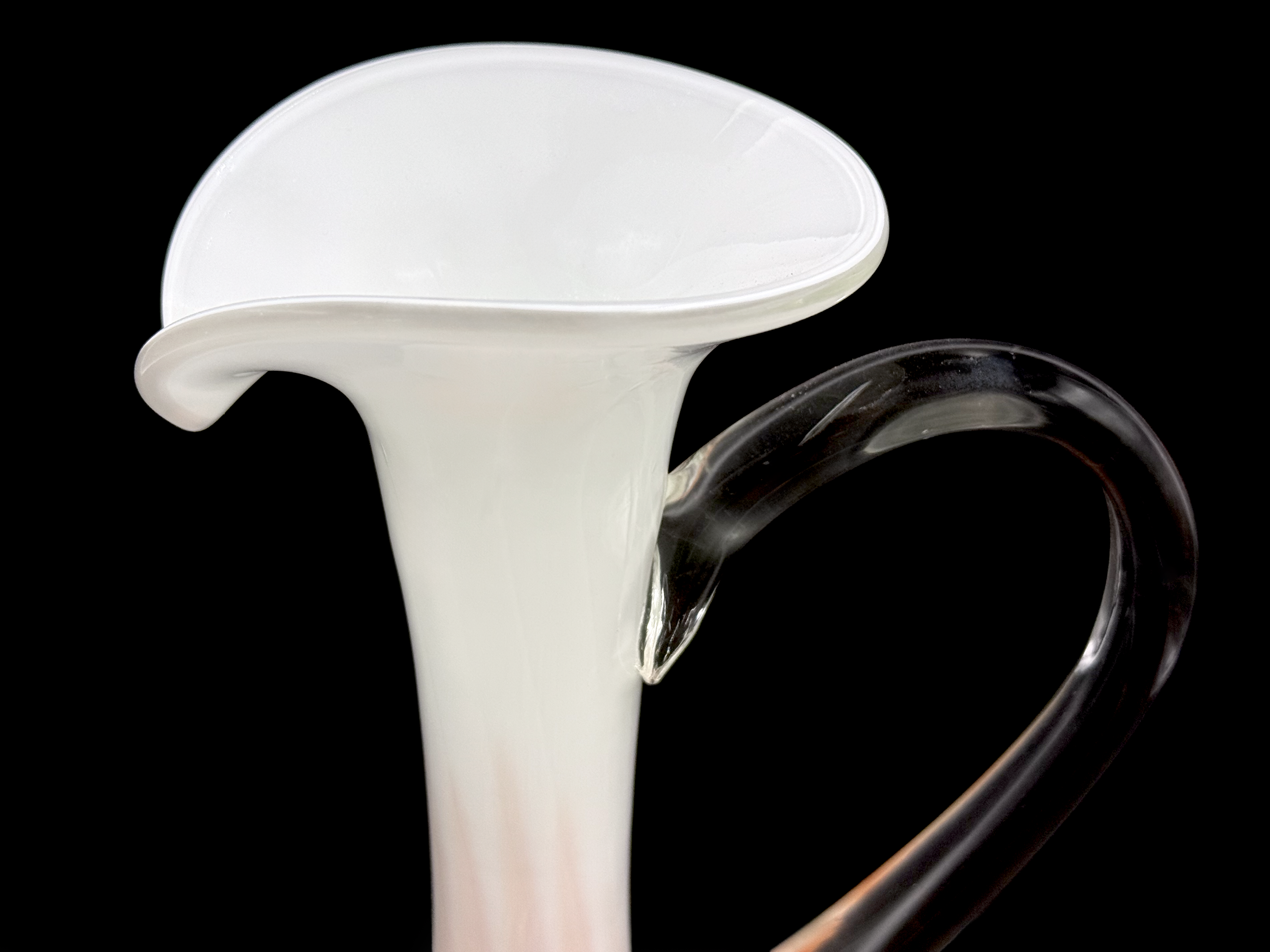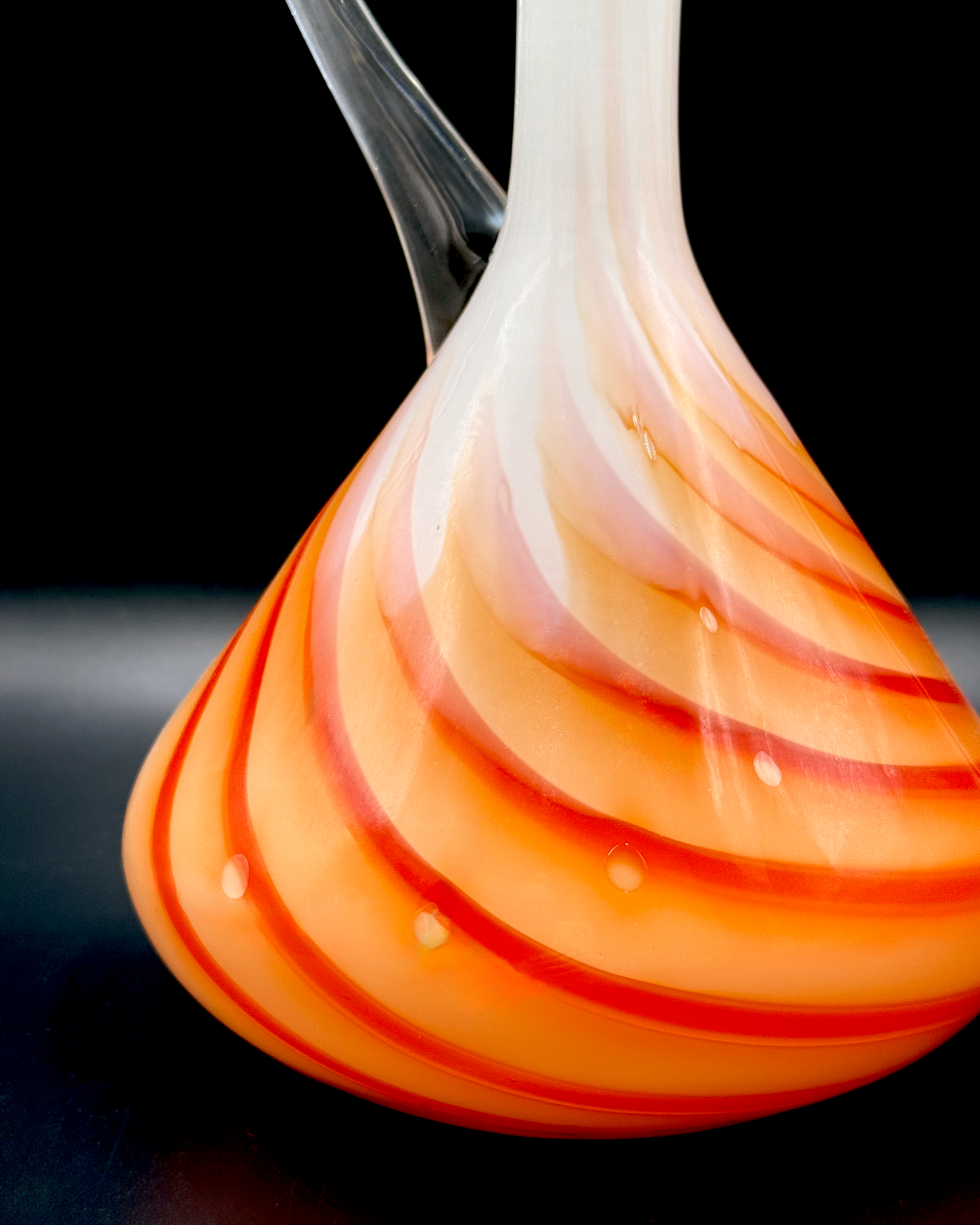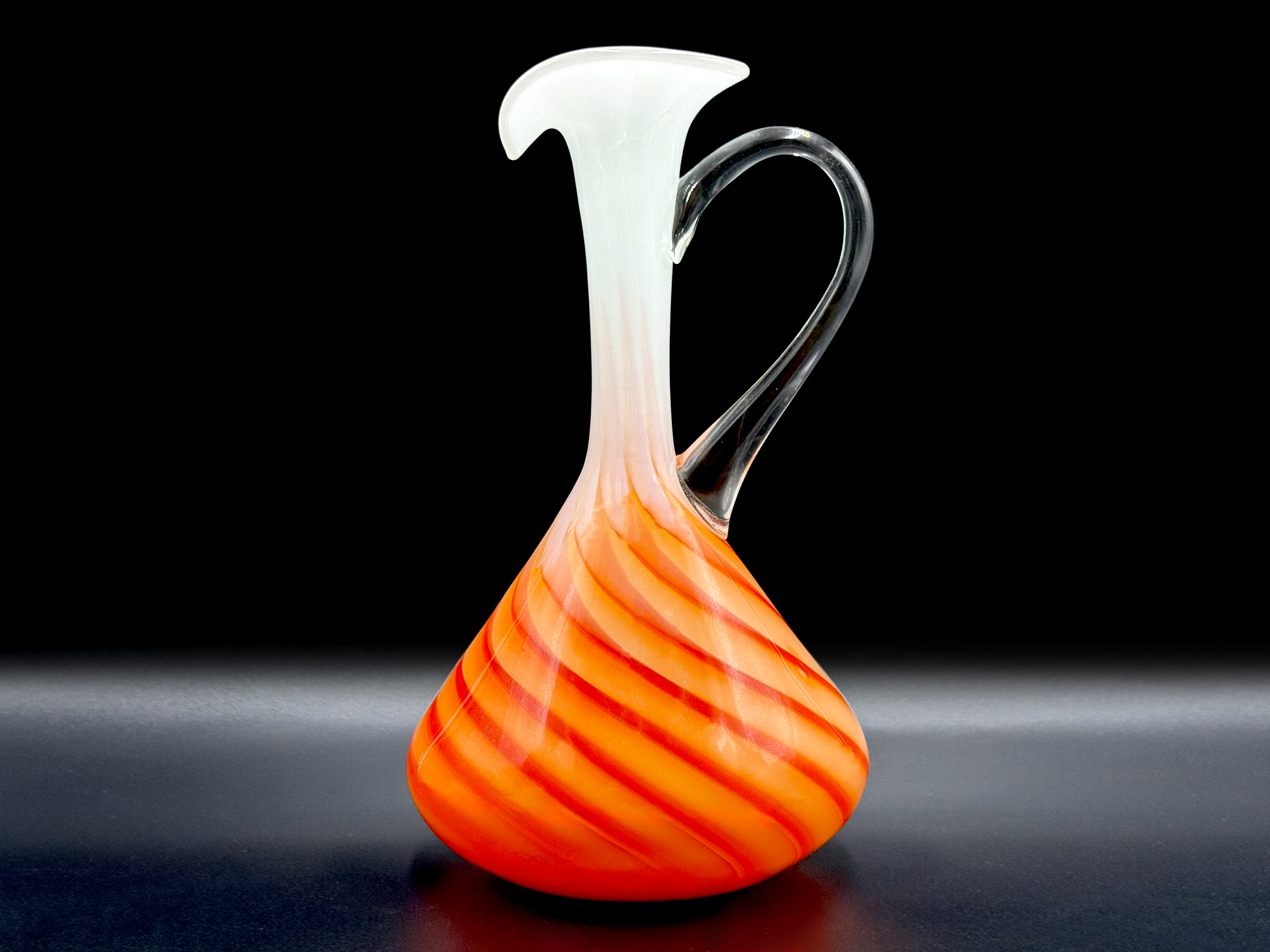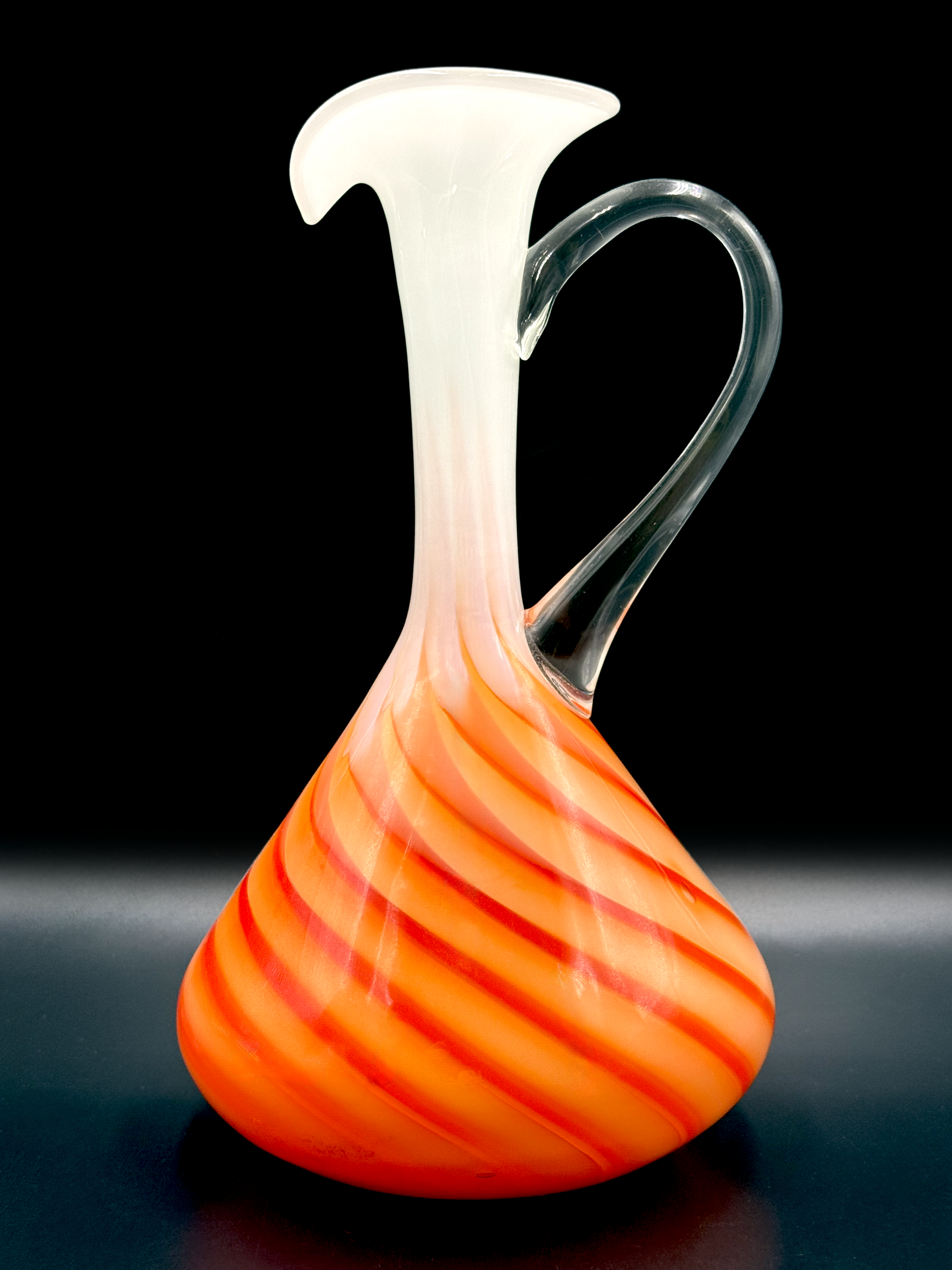 A spectacular find! A cased glass pitcher, in a pattern sometimes referred to as 'tiger glass'. This particular piece was produced by manufacturer Vetreria Artistica Sanminiatello (also known as V.A.S.) who were based just outside of Empoli, in Montelupo.