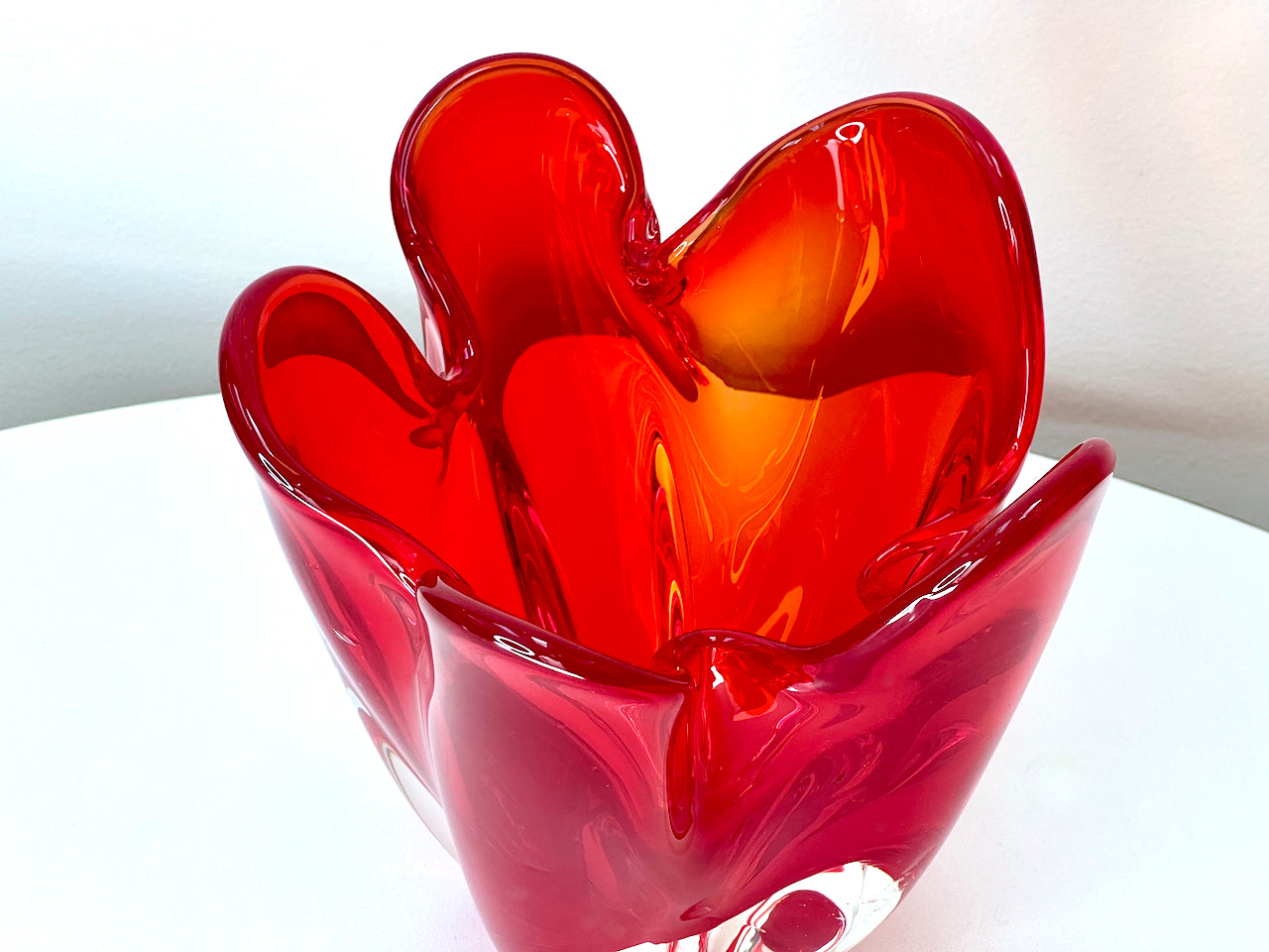 A gorgeous red centrepiece. This style, often referred to as a handkerchief vase, is a well-known model and appears in a variety of colours.
