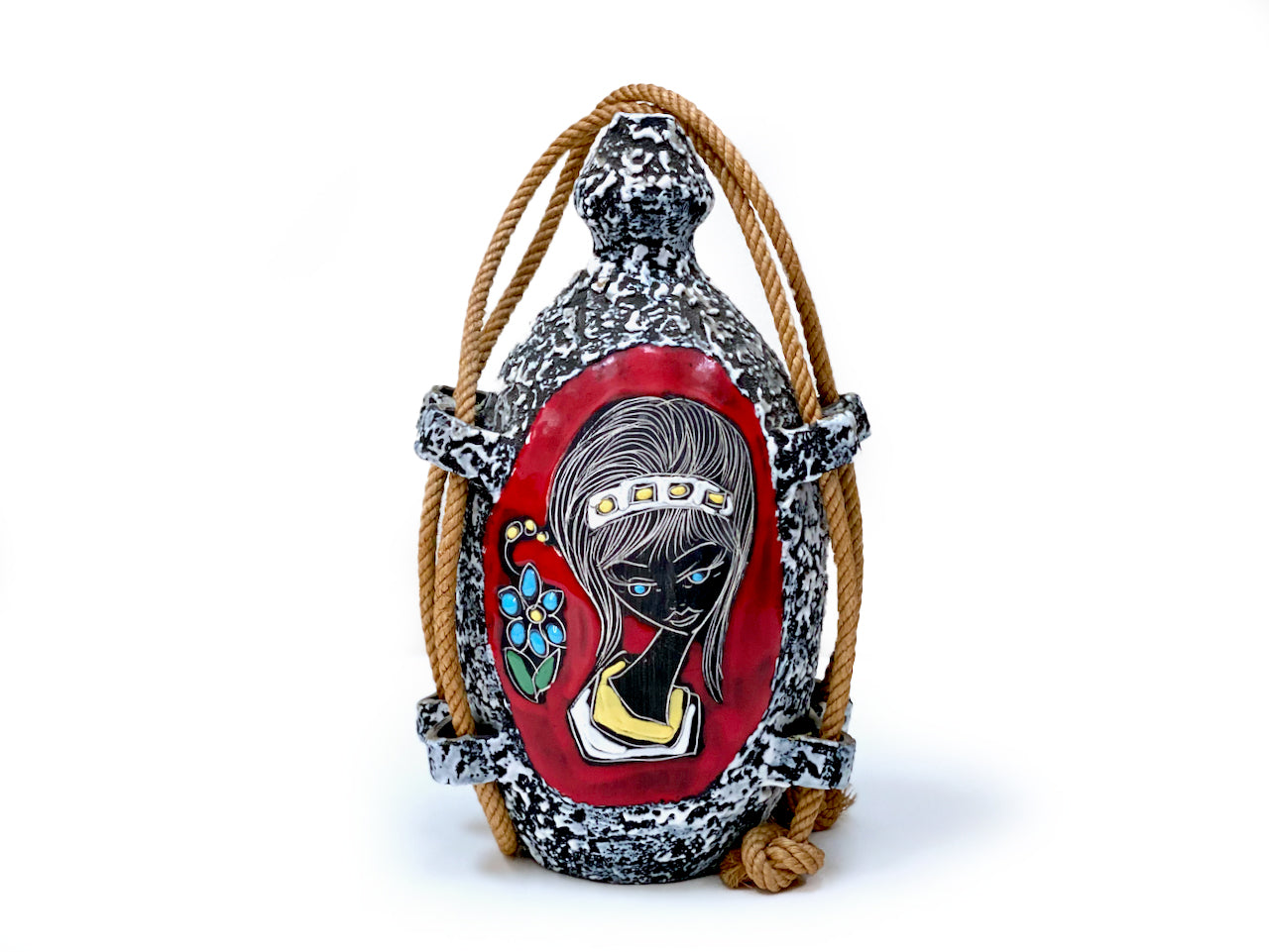 Esta botella/petaca fue fabricada por un fabricante desconocido, ya que no está etiquetada como tal. Sin embargo, creemos que fue fabricada por Libertas. Presenta una cabeza esgrafiada de una mujer y una flor, con un tradicional esmalte de lava o espuma de fondo.