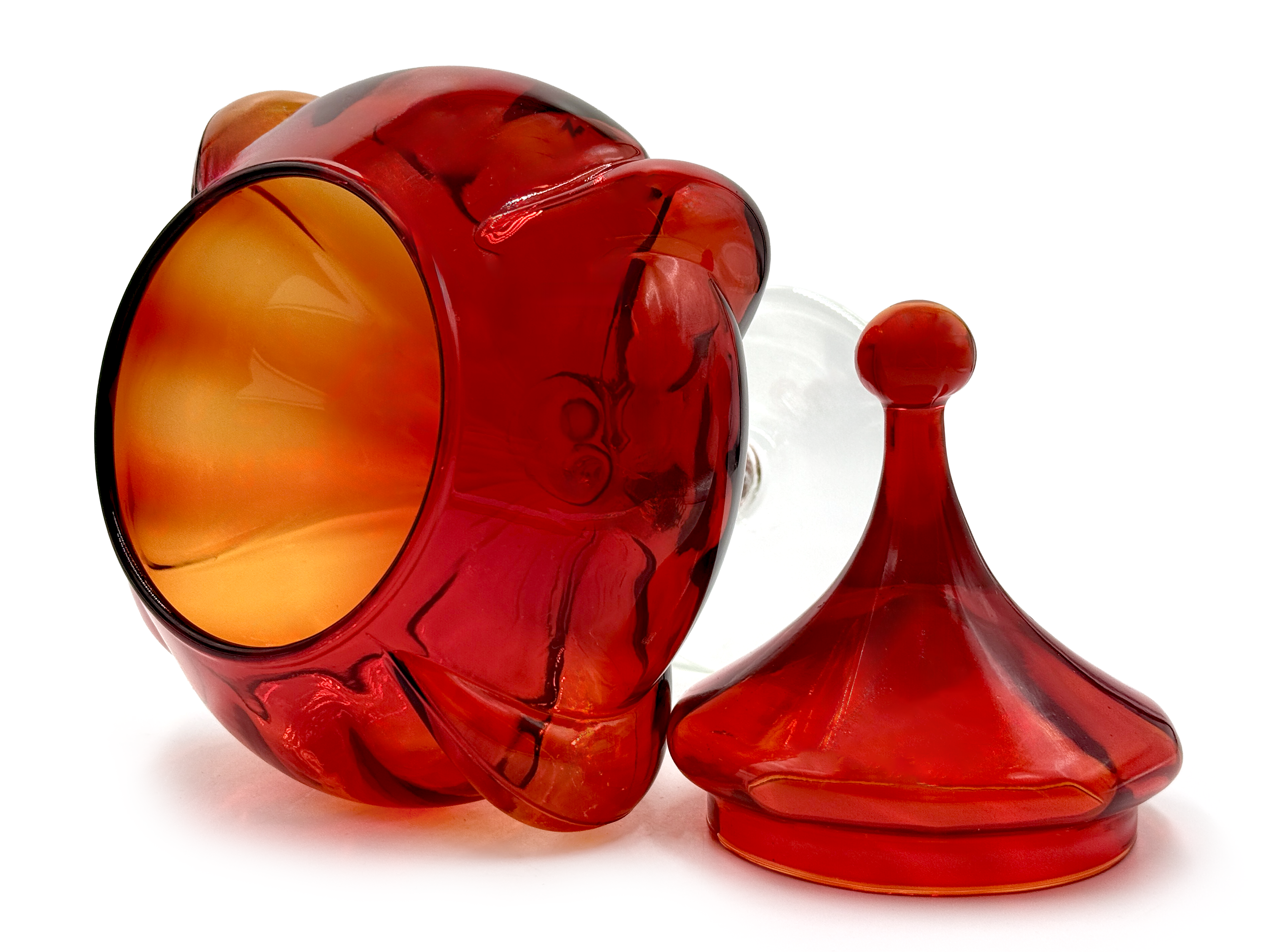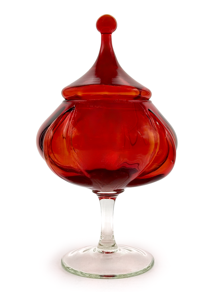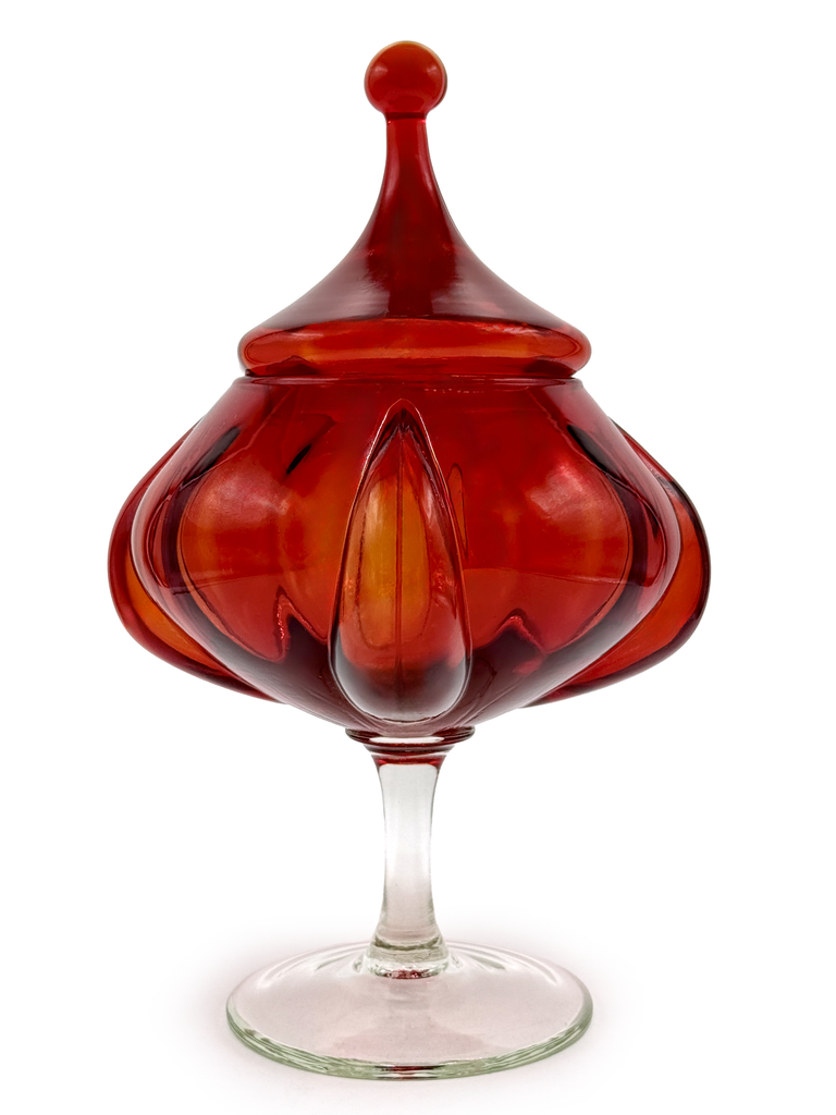 ¡Un hallazgo espectacular! Un plato para dulces de tallo alto en un glorioso azul verdoso con un tallo verde lima. Completo con tapa original, en un diseño conocido como "carpa de circo".