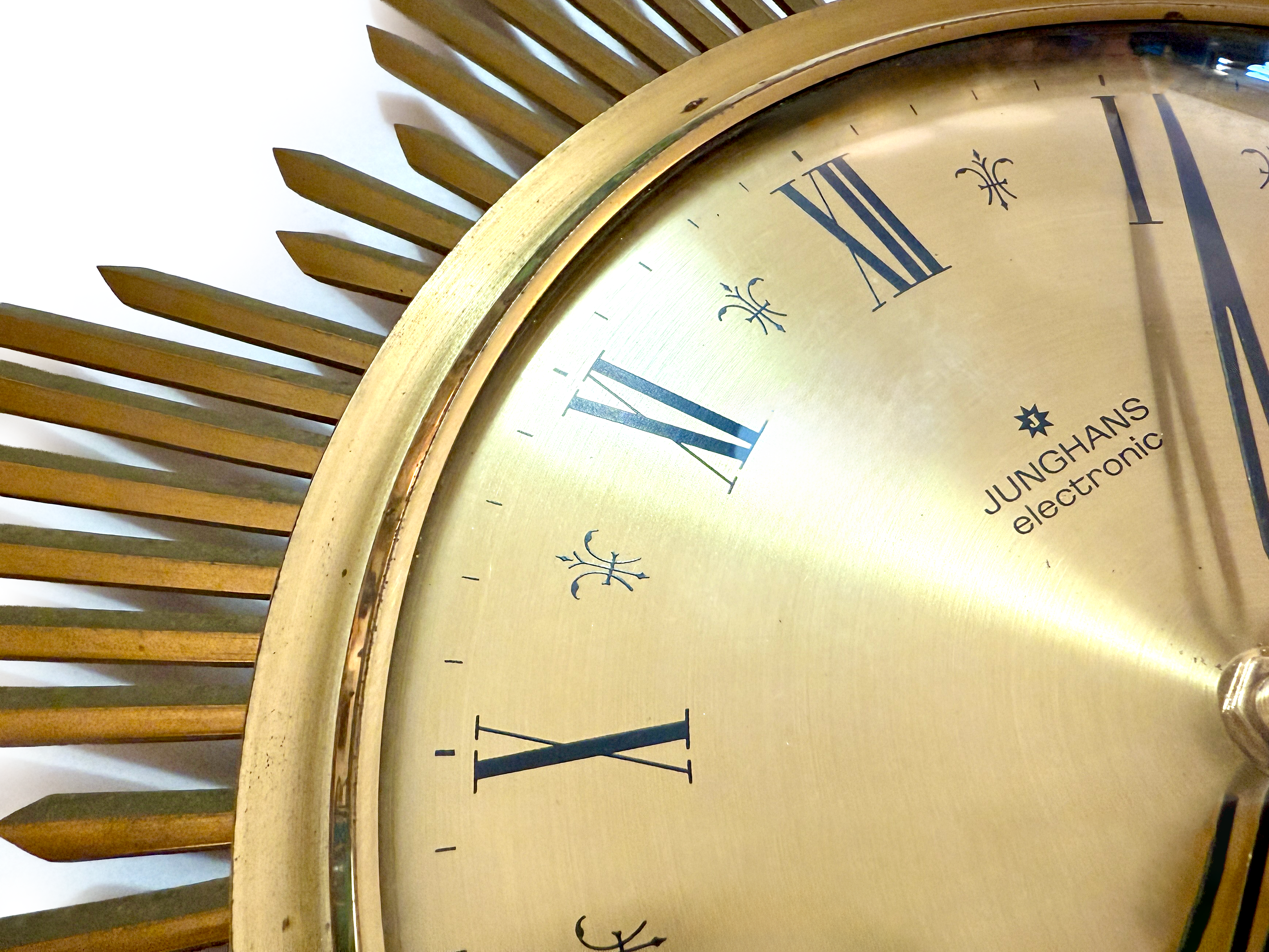Esta pieza en particular presenta picos de latón con efecto estrella/sol, y una esfera de reloj de latón. Los números y las manecillas son negros.
