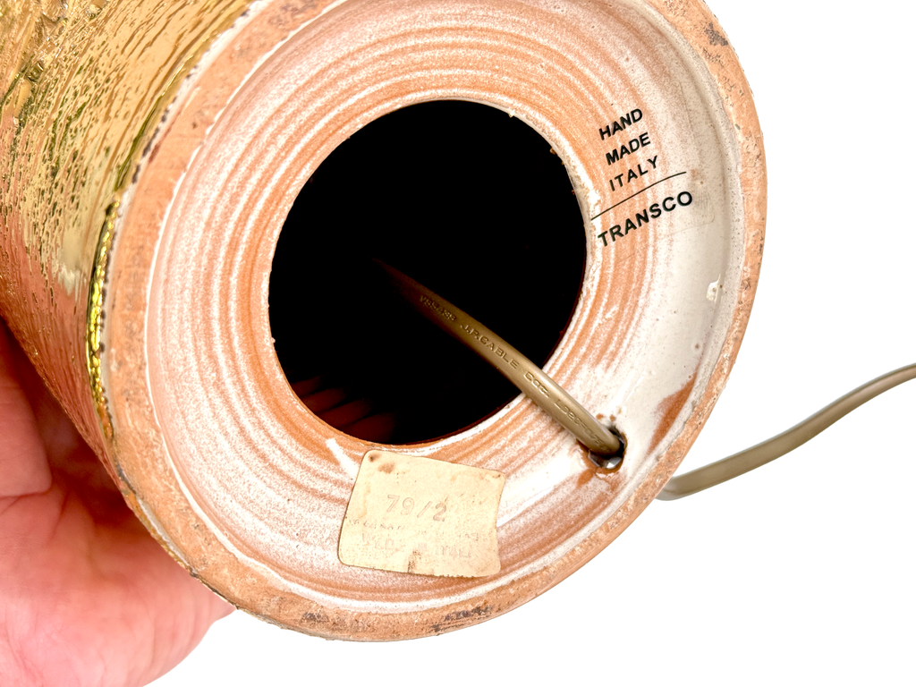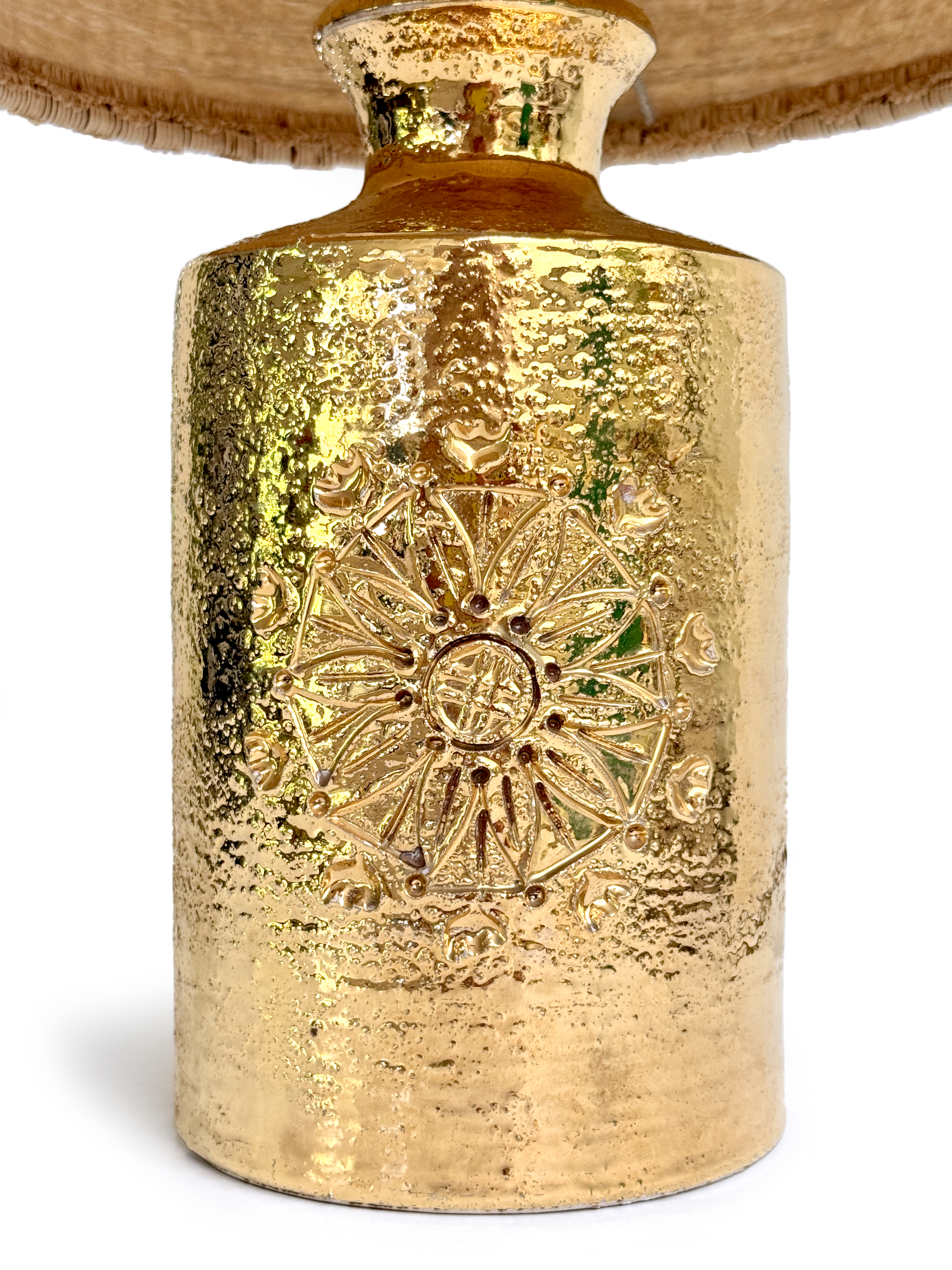 Fabulosa lámpara de mesa de cerámica con decoración 'Spagnolo', en color amarillo mostaza, alrededor de los años 60. Este diseño fue producido para el mercado australiano e importado a través del importador australiano Erica; todavía tiene su etiqueta original intacta.