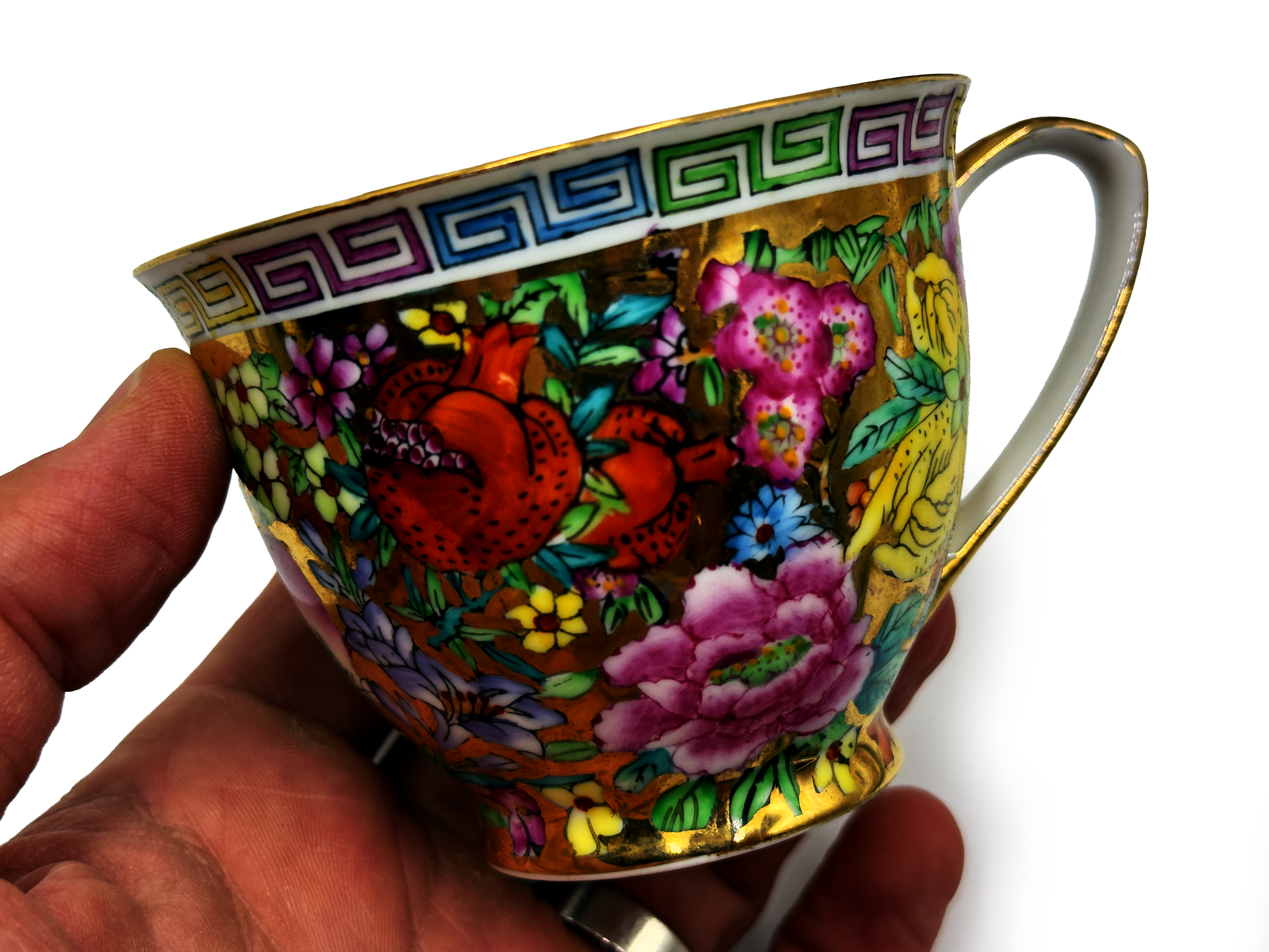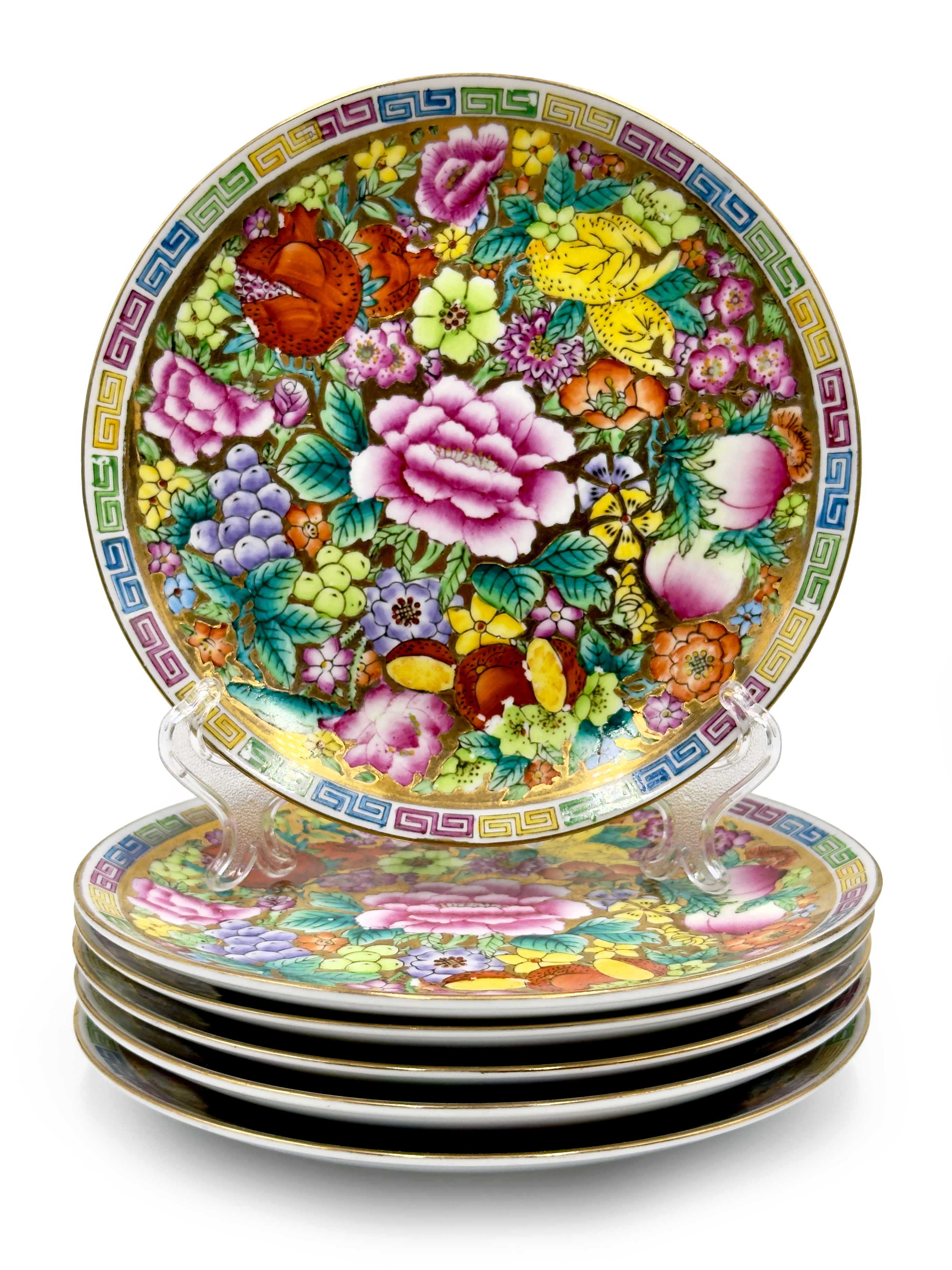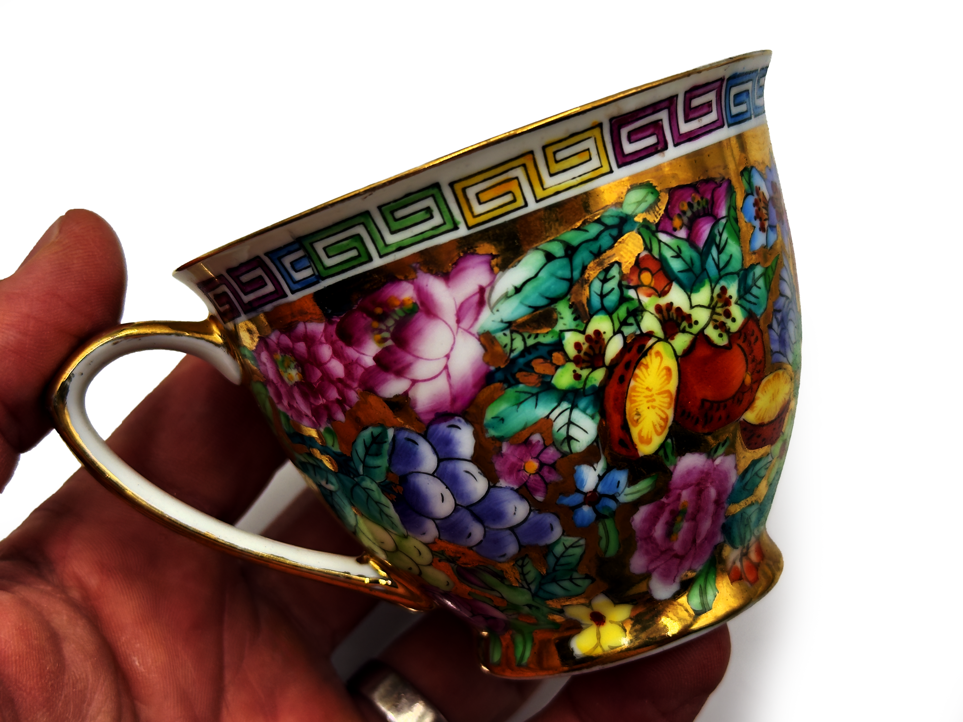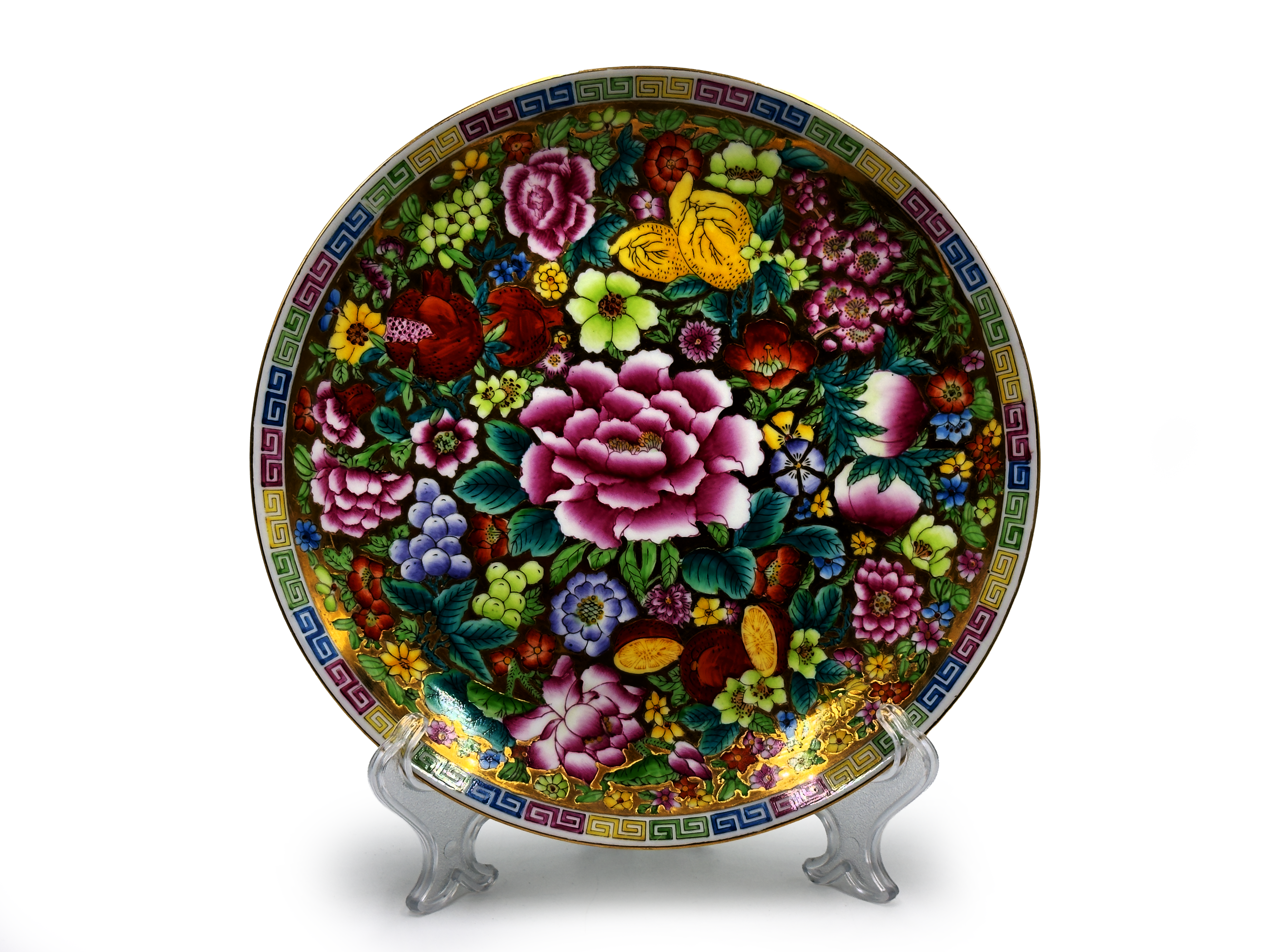 Fabricada en el estilo Imari, esta pieza brillante y colorida presenta un diseño de pájaro en perfecto estado vintage, con borde dorado y detalles adicionales en el acabado.