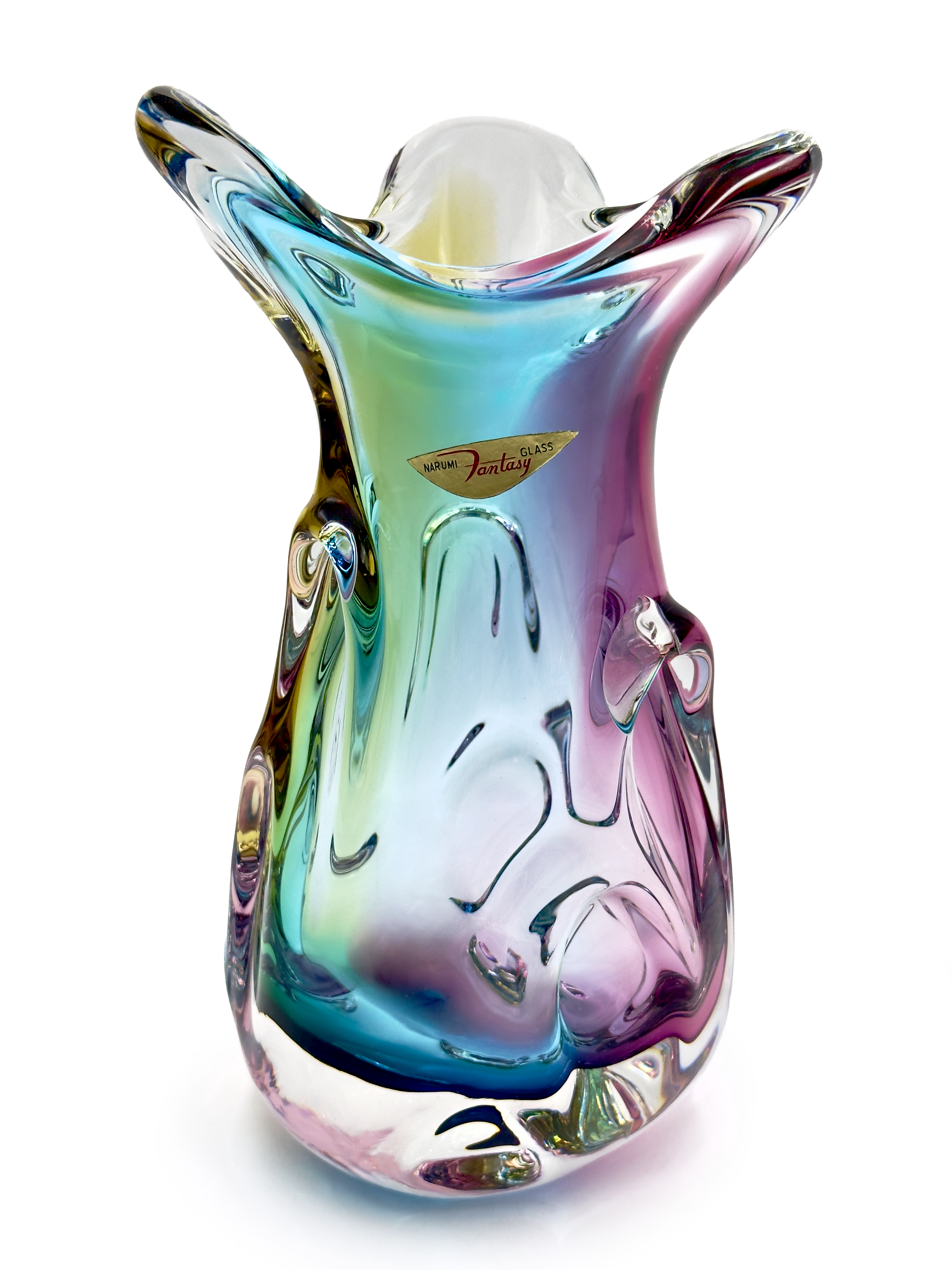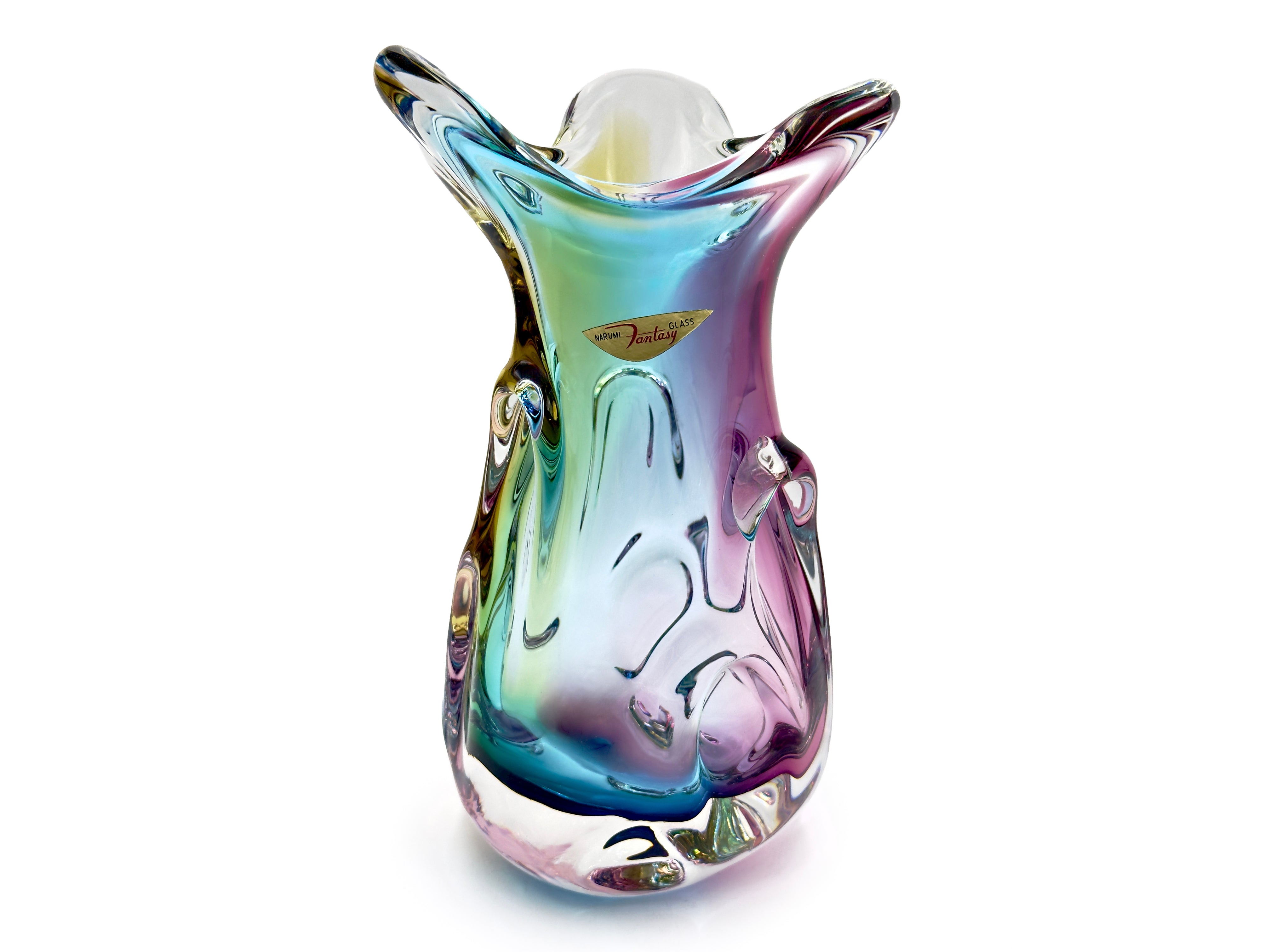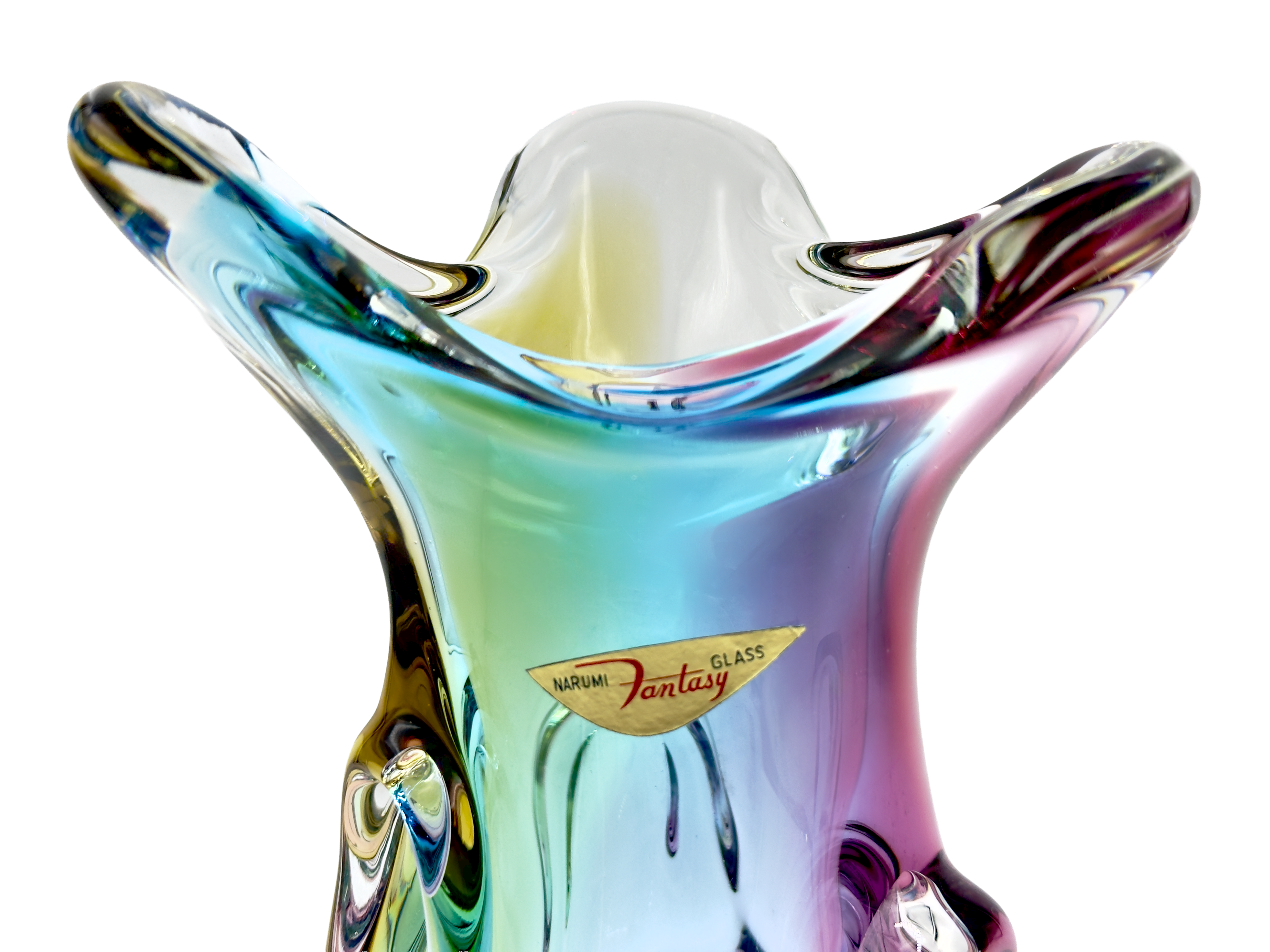 Un magnífico jarrón alto de la línea "Fantasía" de la compañía, producido bajo la marca Narumi. Esta pieza en particular combina azul, naranja y rosa a través del cristal transparente.