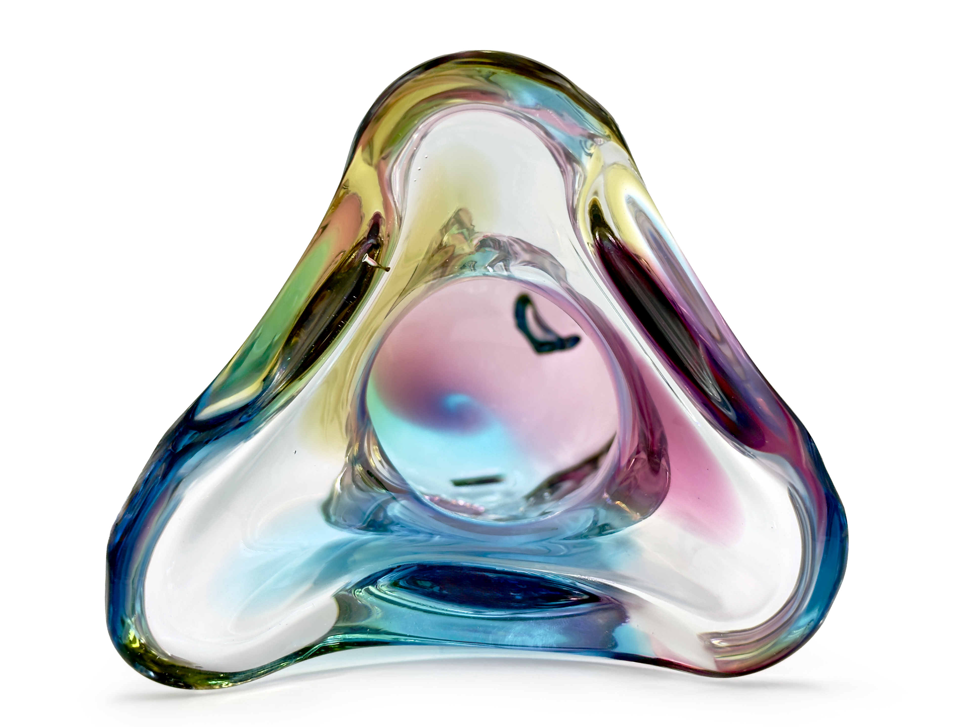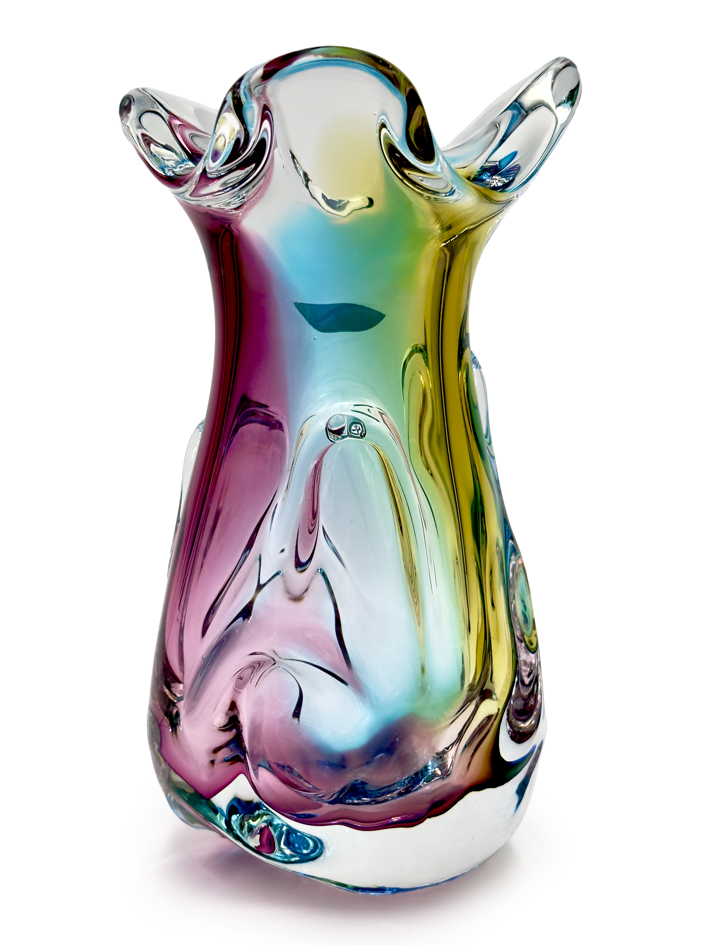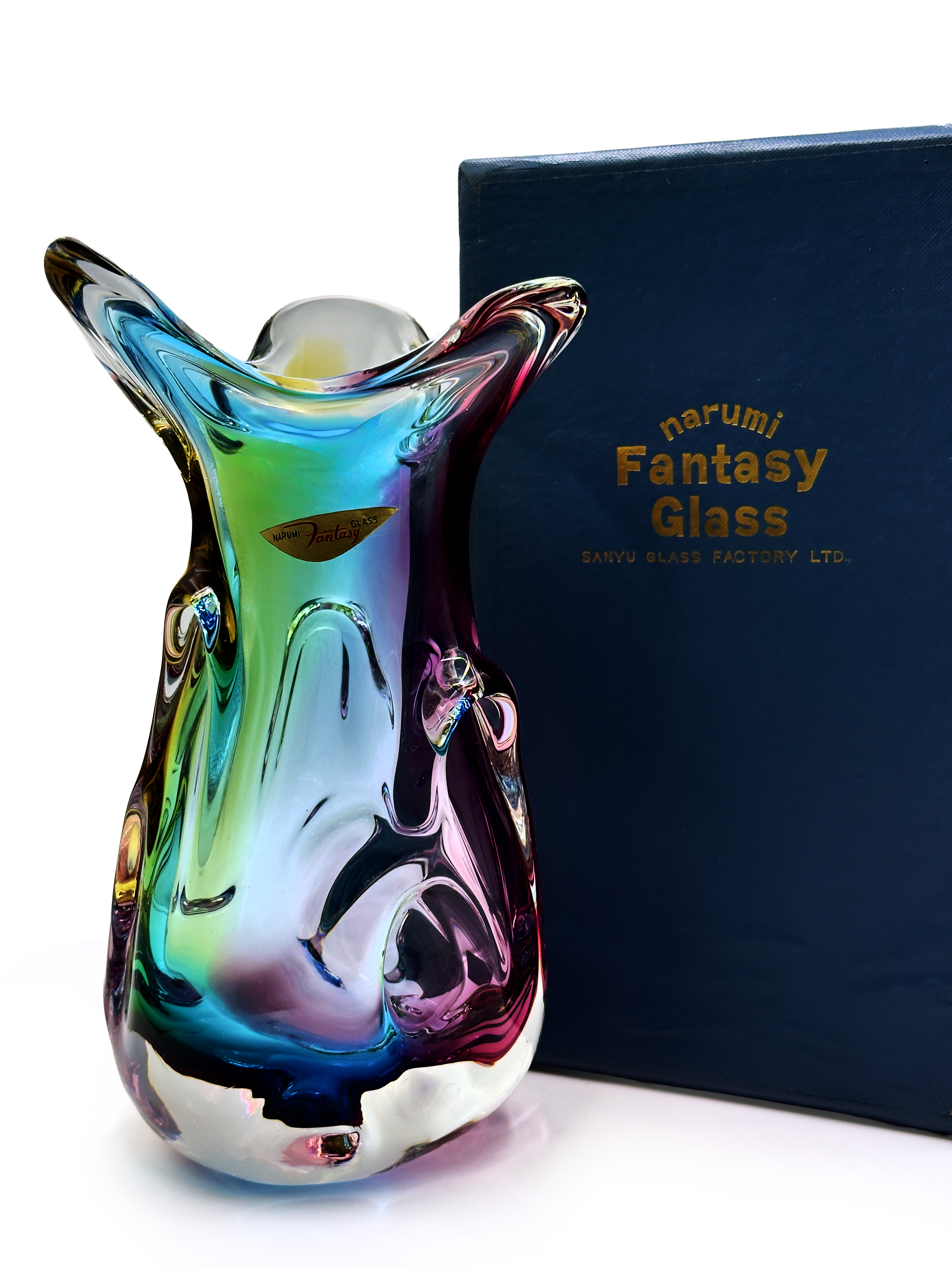 Un magnífico jarrón alto de la línea "Fantasía" de la compañía, producido bajo la marca Narumi. Esta pieza en particular combina azul, naranja y rosa a través del cristal transparente.