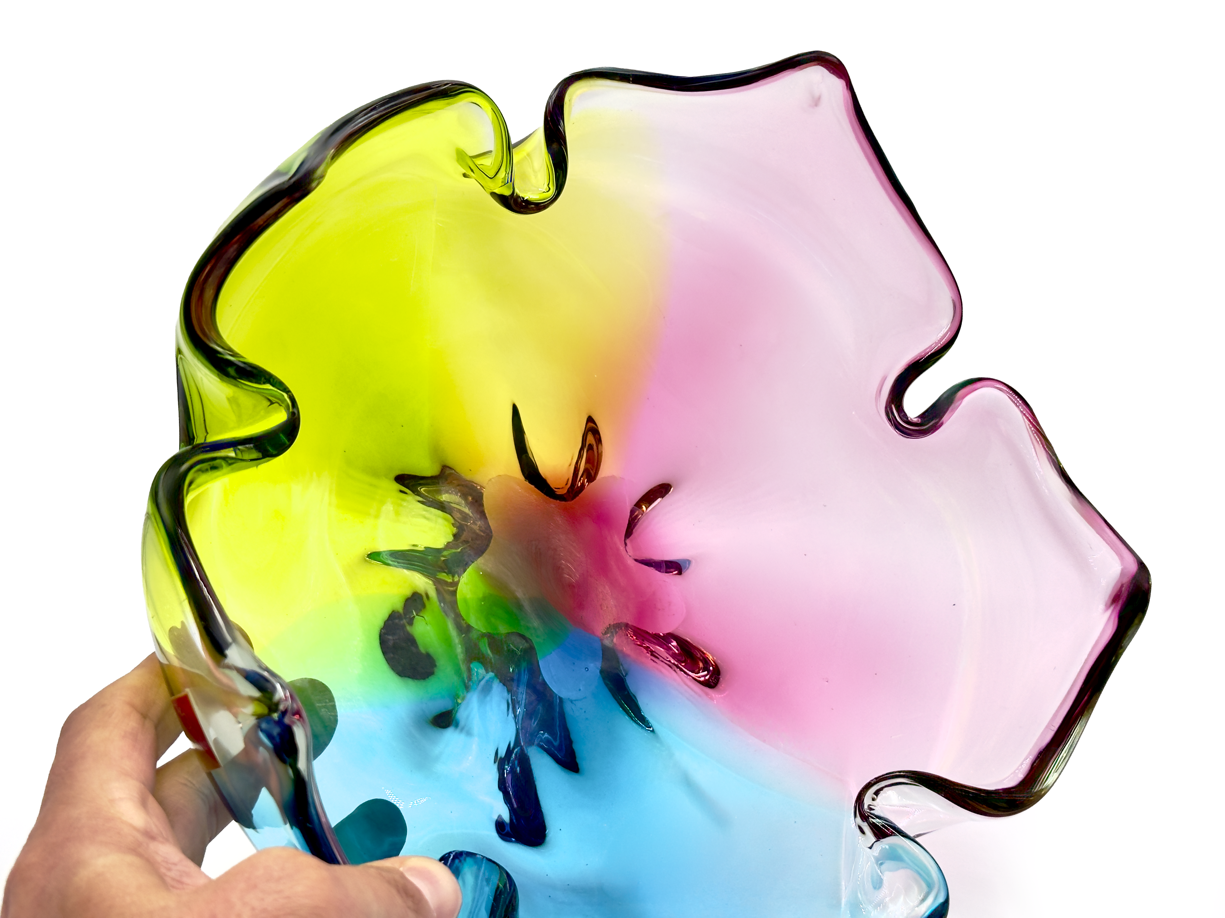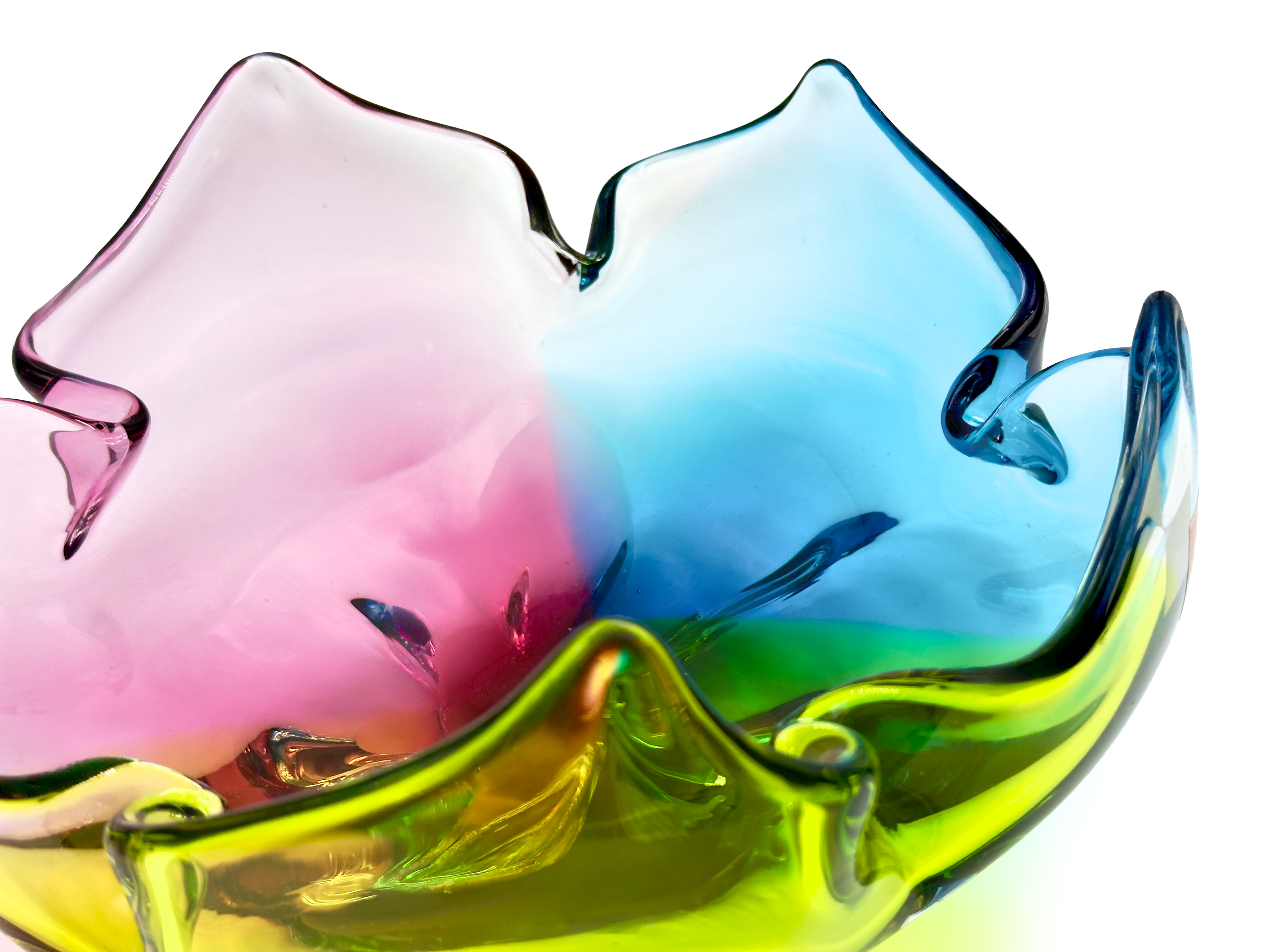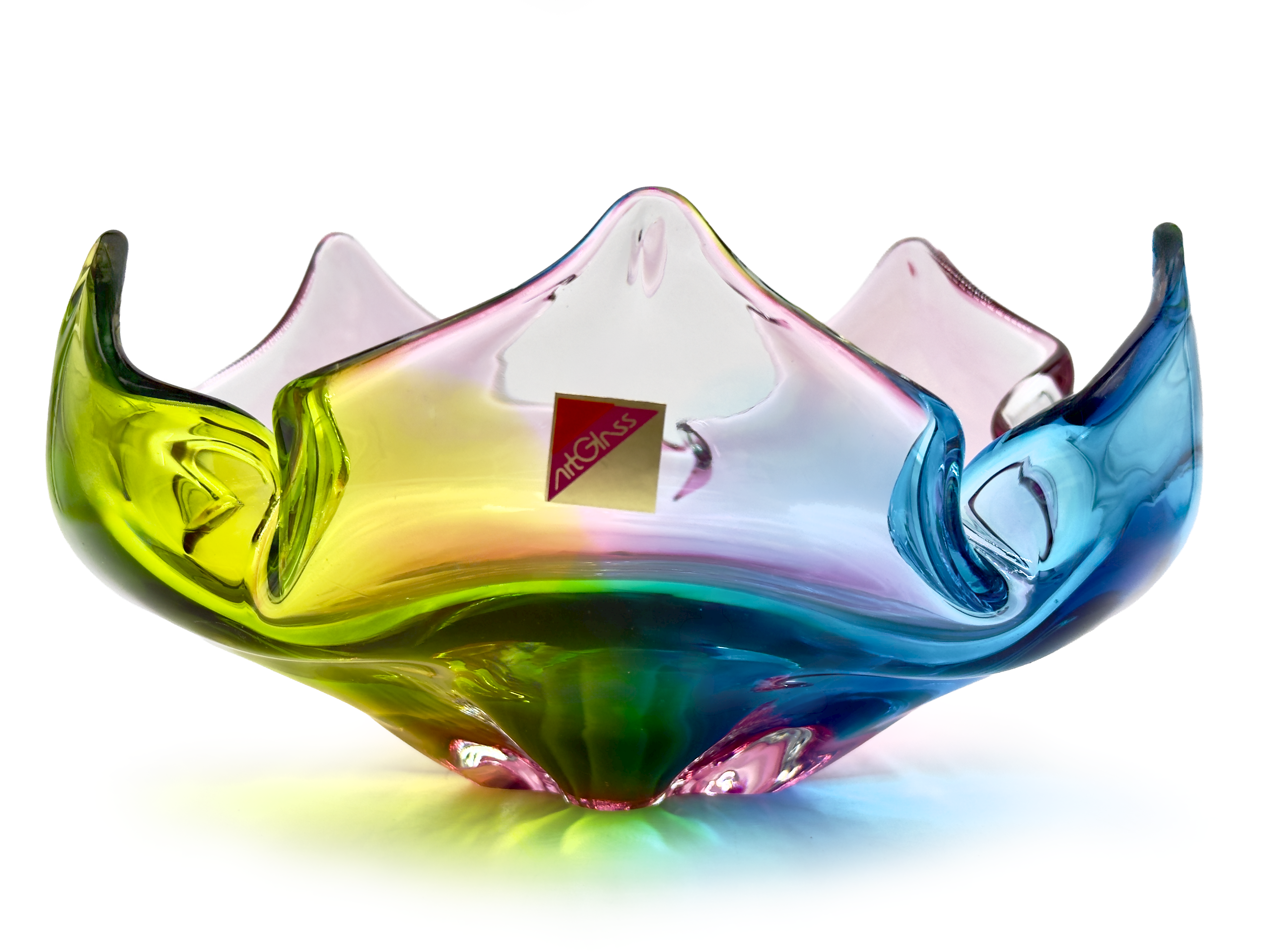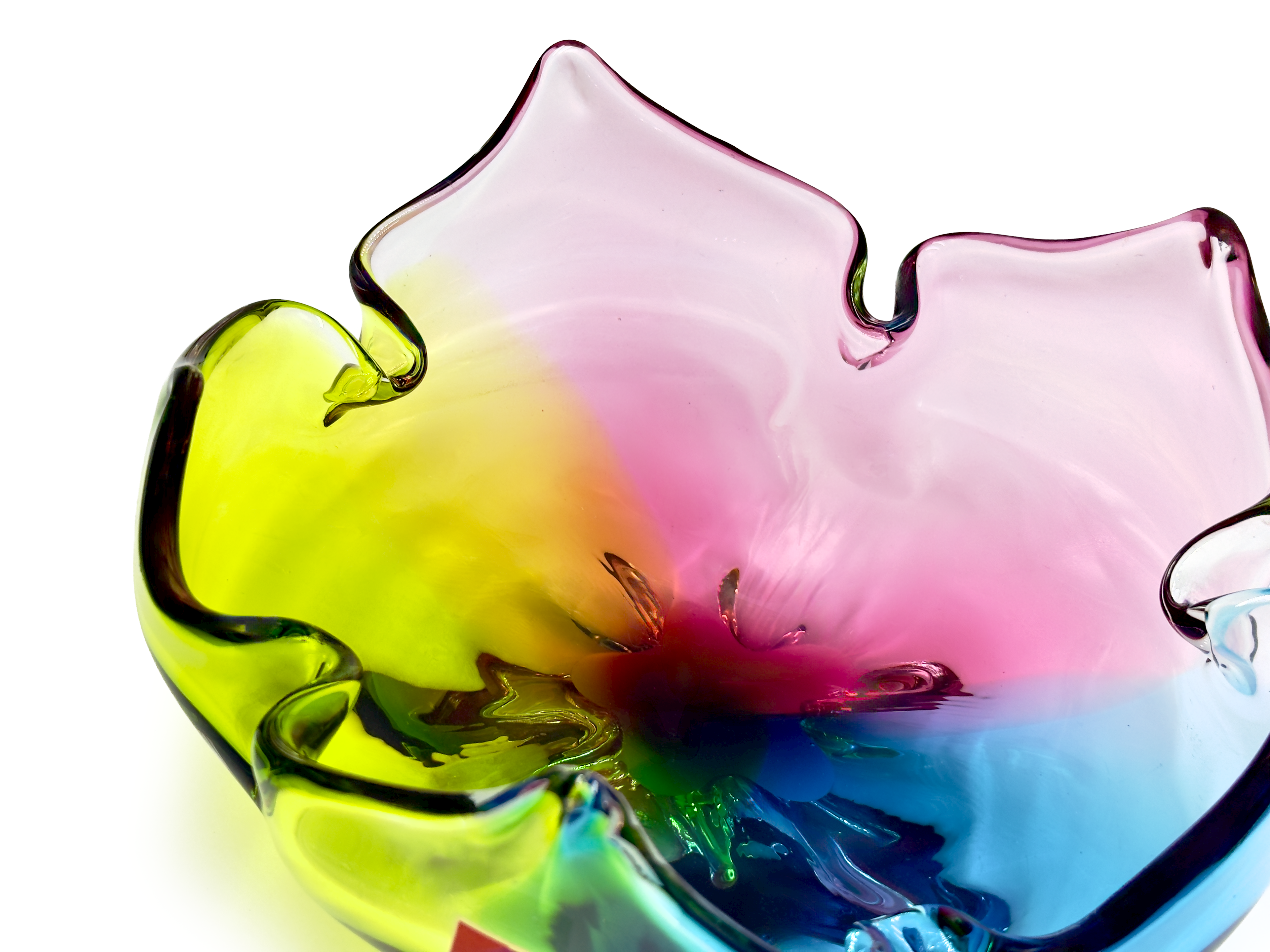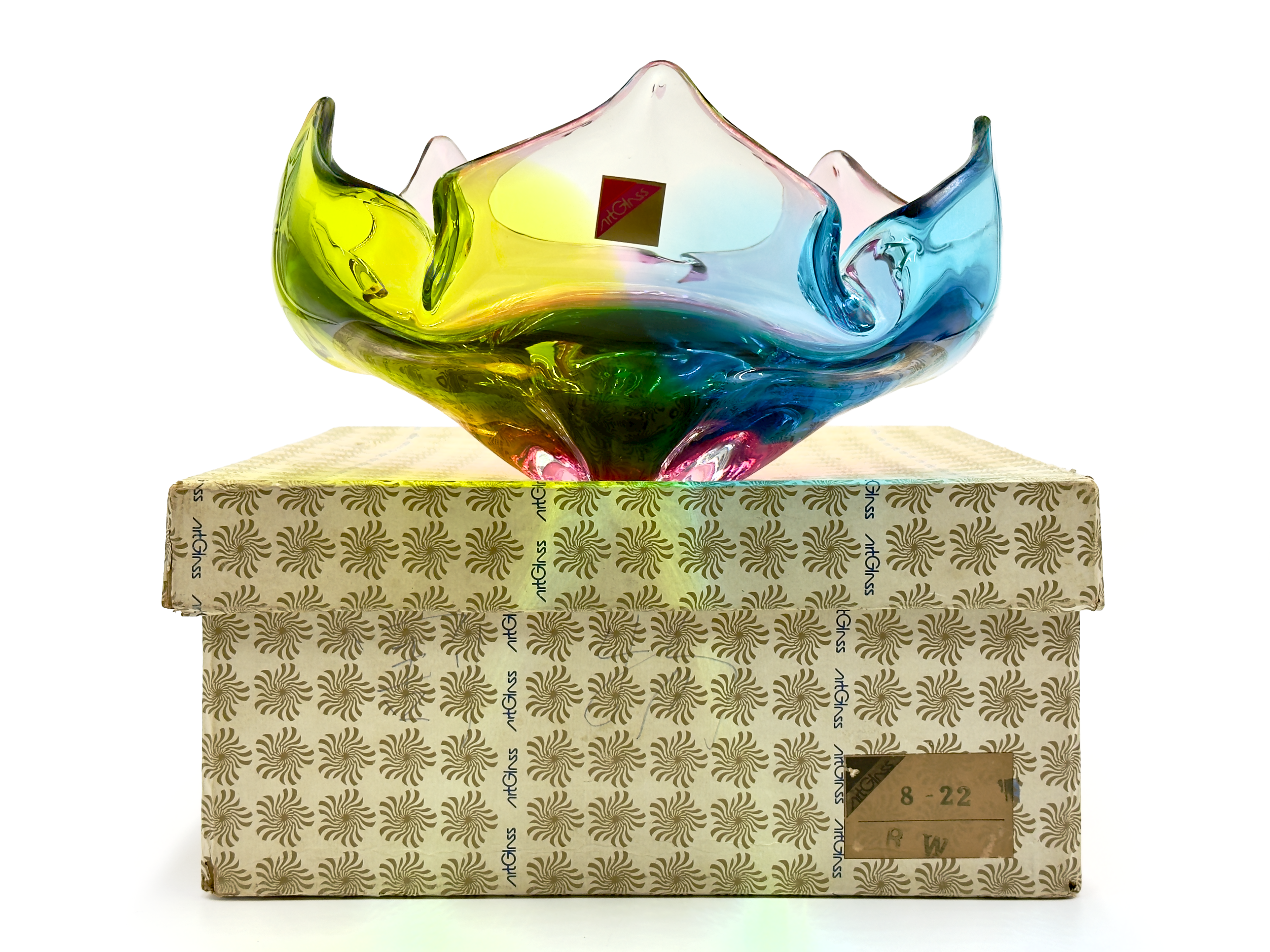 The company reached a creative and production peak during the 1960s and 1970s, releasing a diverse range of vases, centrepieces, and art glass pieces. They captured the aesthetic of mid-century modern design, frequently featuring vibrant swirls of colour cased in thick, clear glass.